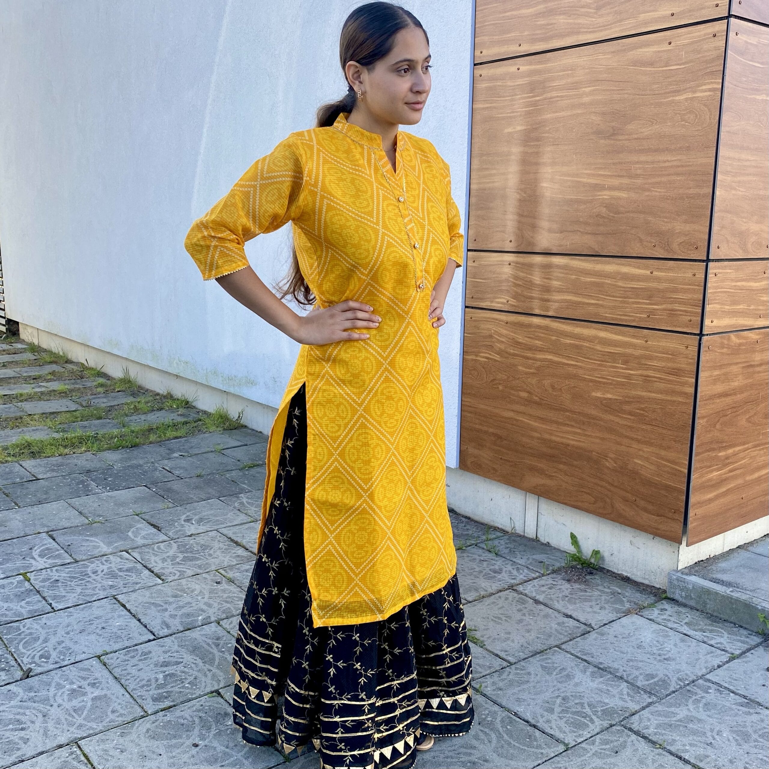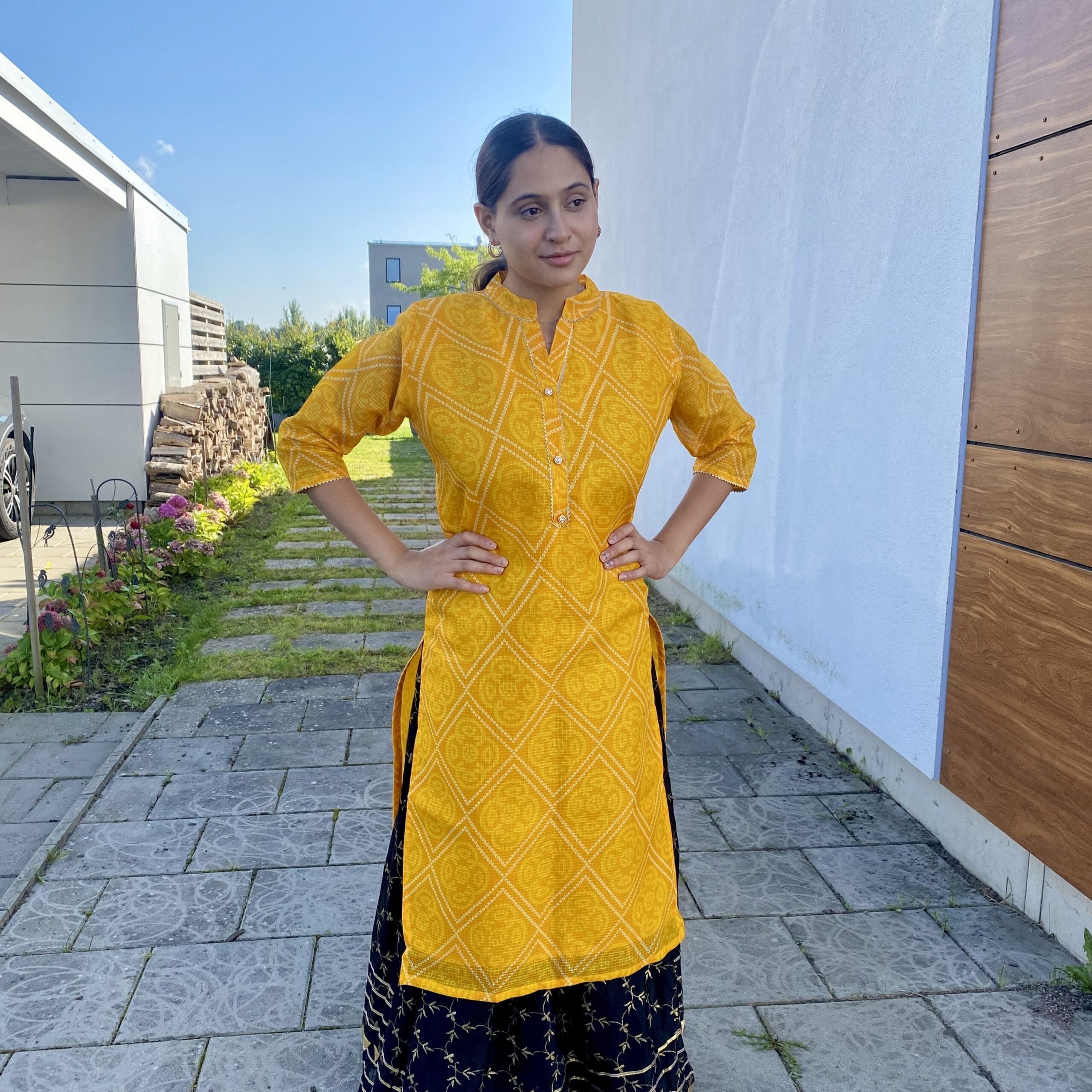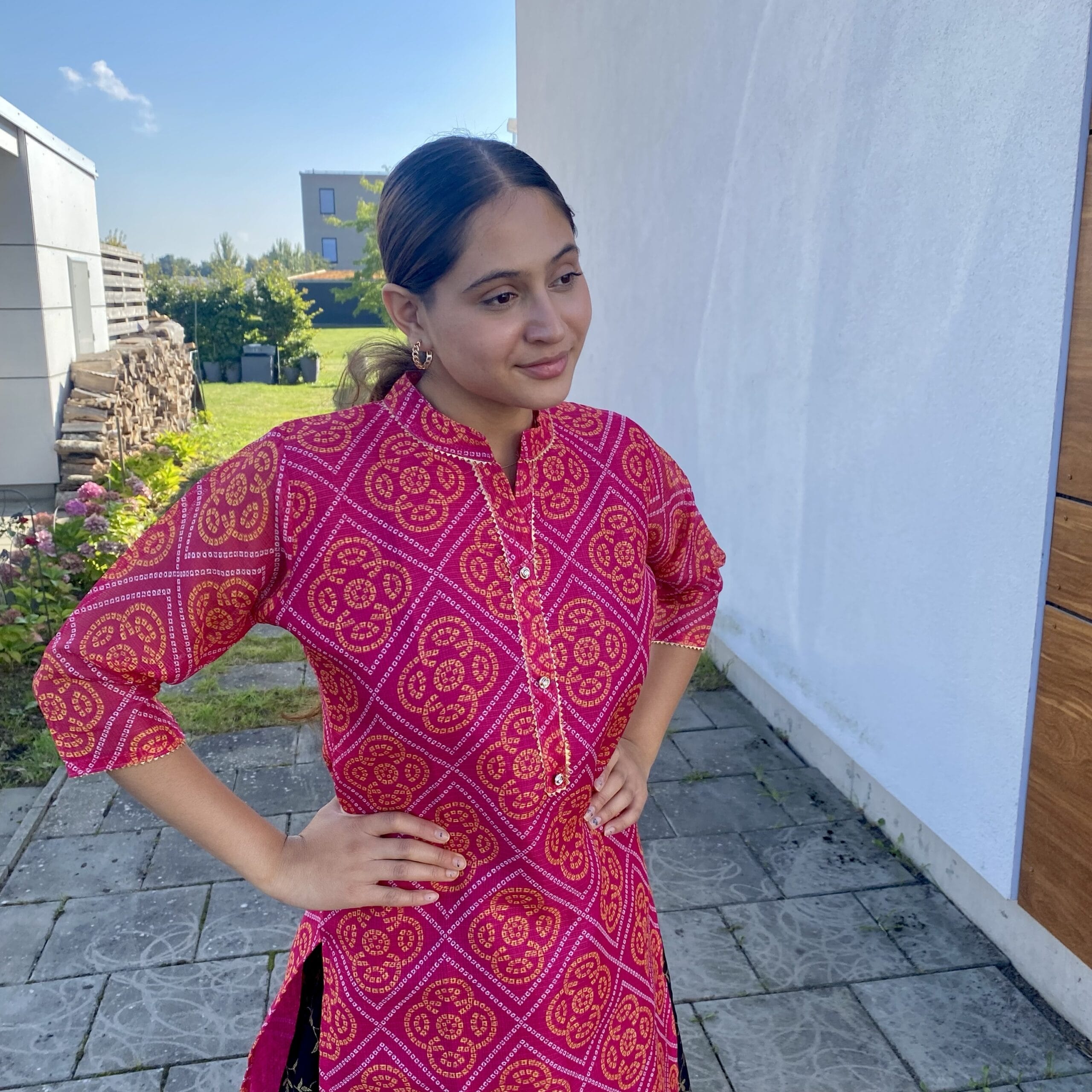 A lightweight and elegant Bandhani Print Kota Doria Kurti designed in a regular straight fit with a breathable and comfortable feel. Crafted in traditional Bandhani-inspired patterns, this kurti blends everyday comfort with cultural charm.