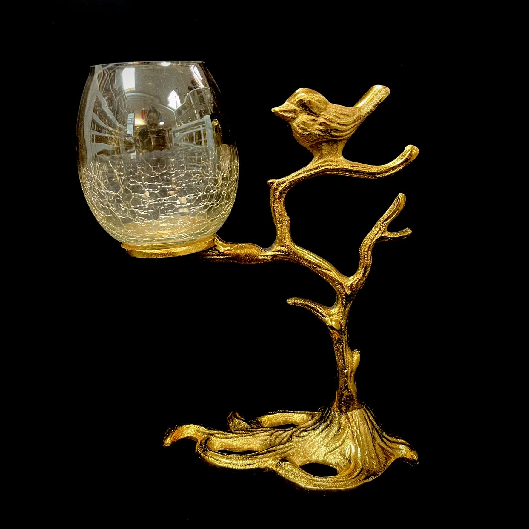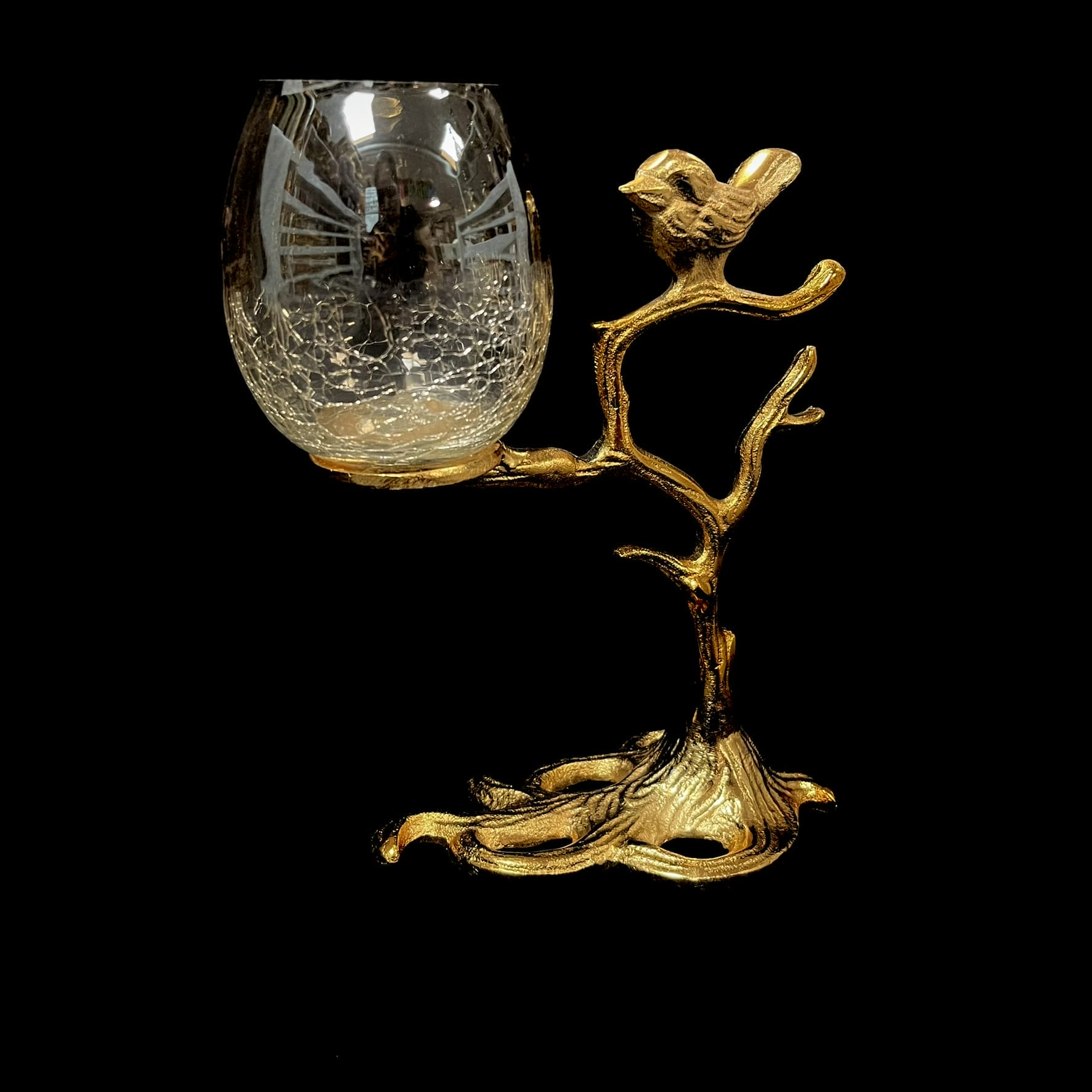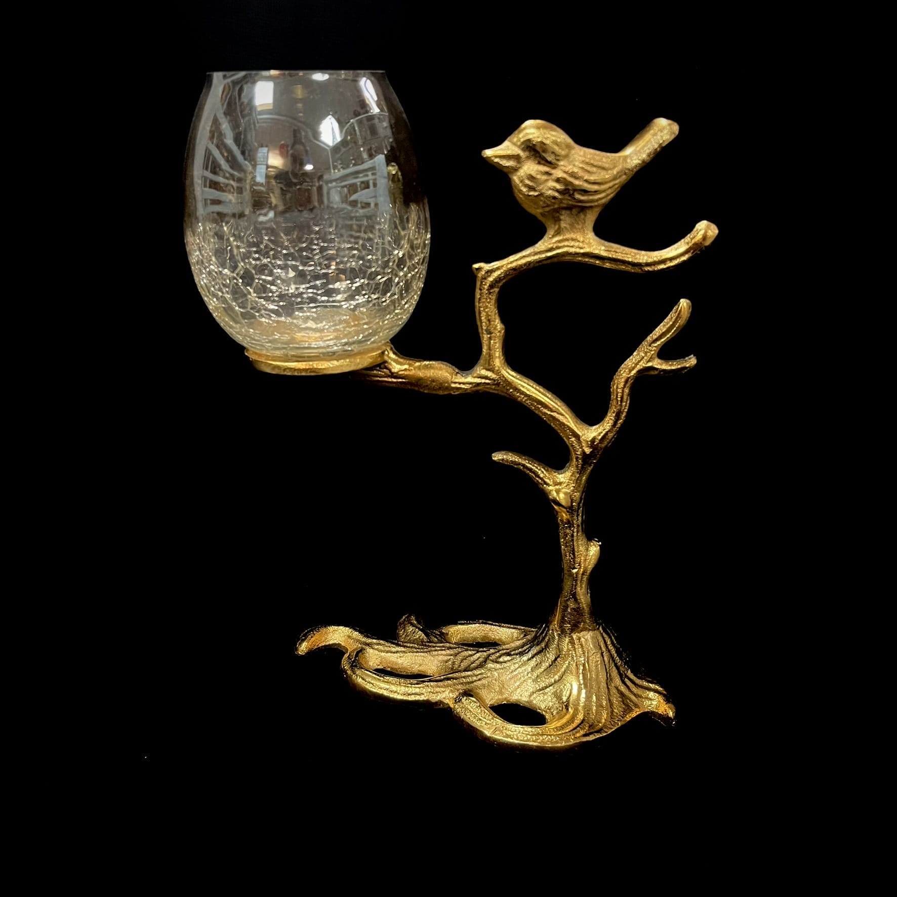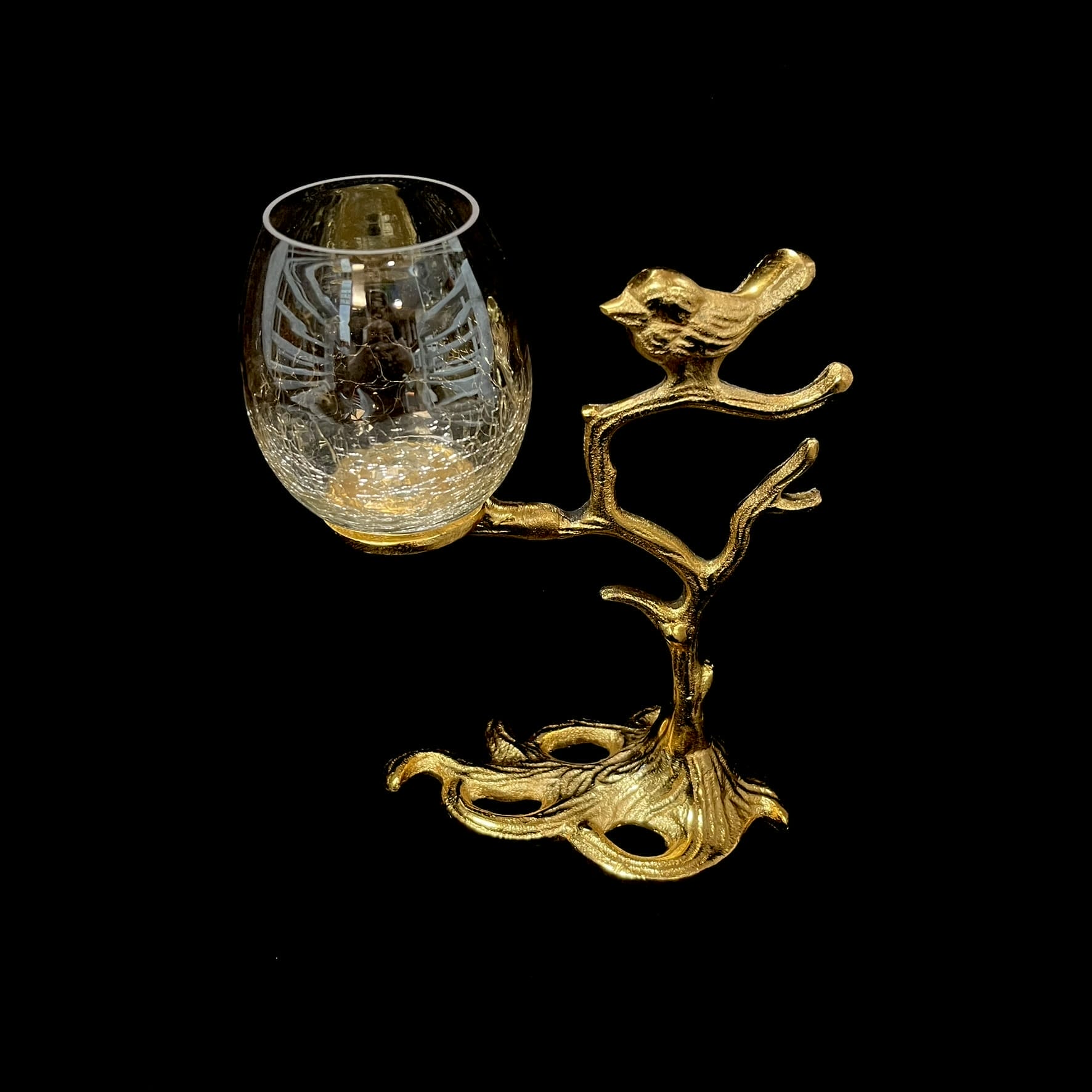 Crafted in an antique gold finish with a delicate bird perched on a branch, paired with a crackle glass holder, this piece creates a soft ambient glow perfect for cozy evenings and refined table styling. Its artistic form makes it both a functional candle holder and a decorative accent.