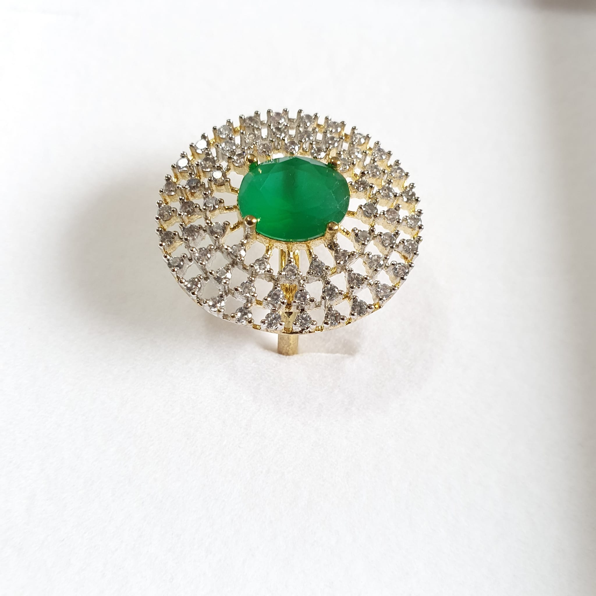 Featuring a bold emerald-tone center stone surrounded by fine crystal detailing (American diamond), this ring blends classic shine with modern styling. Lightweight and comfortable, it works beautifully for both everyday wear and special occasions.