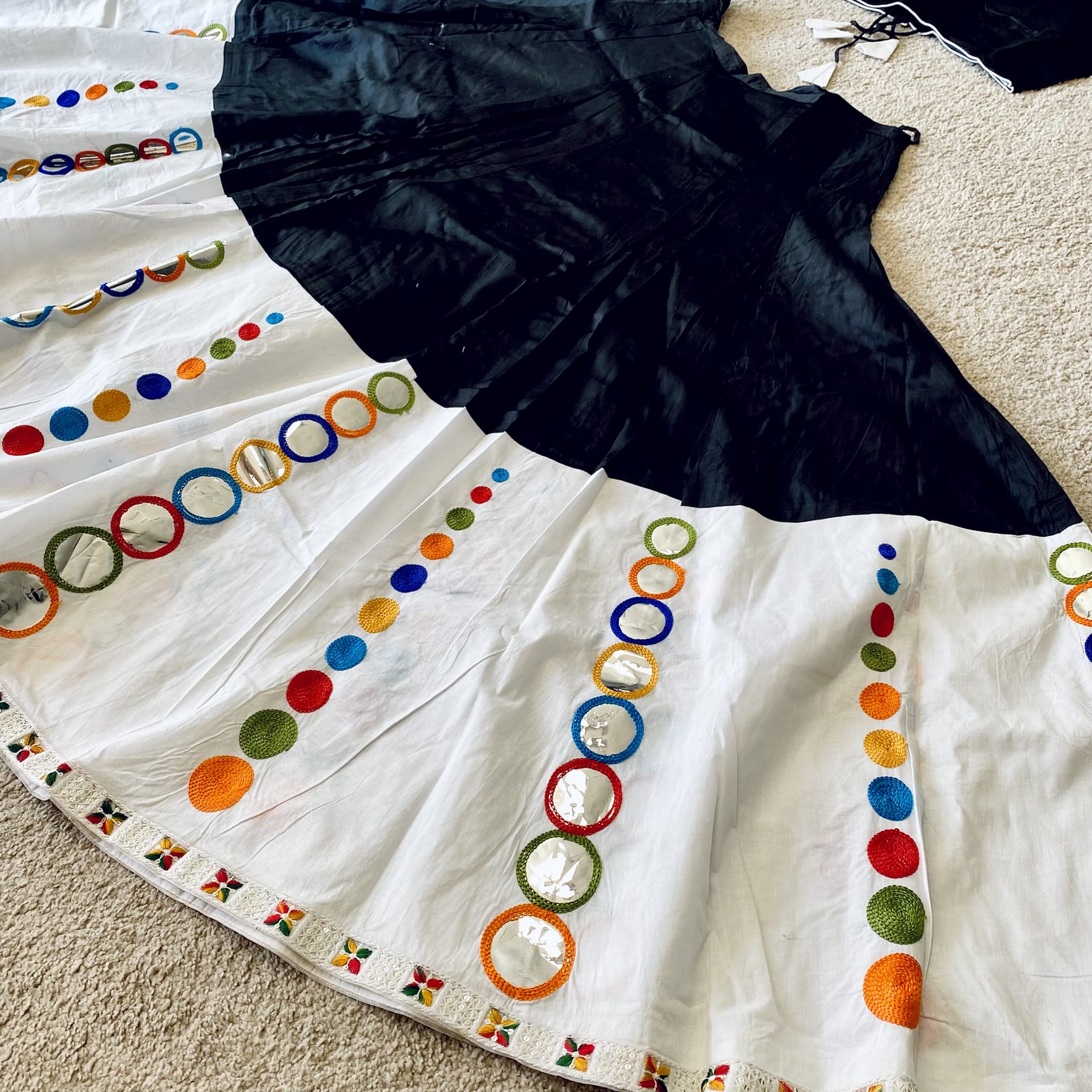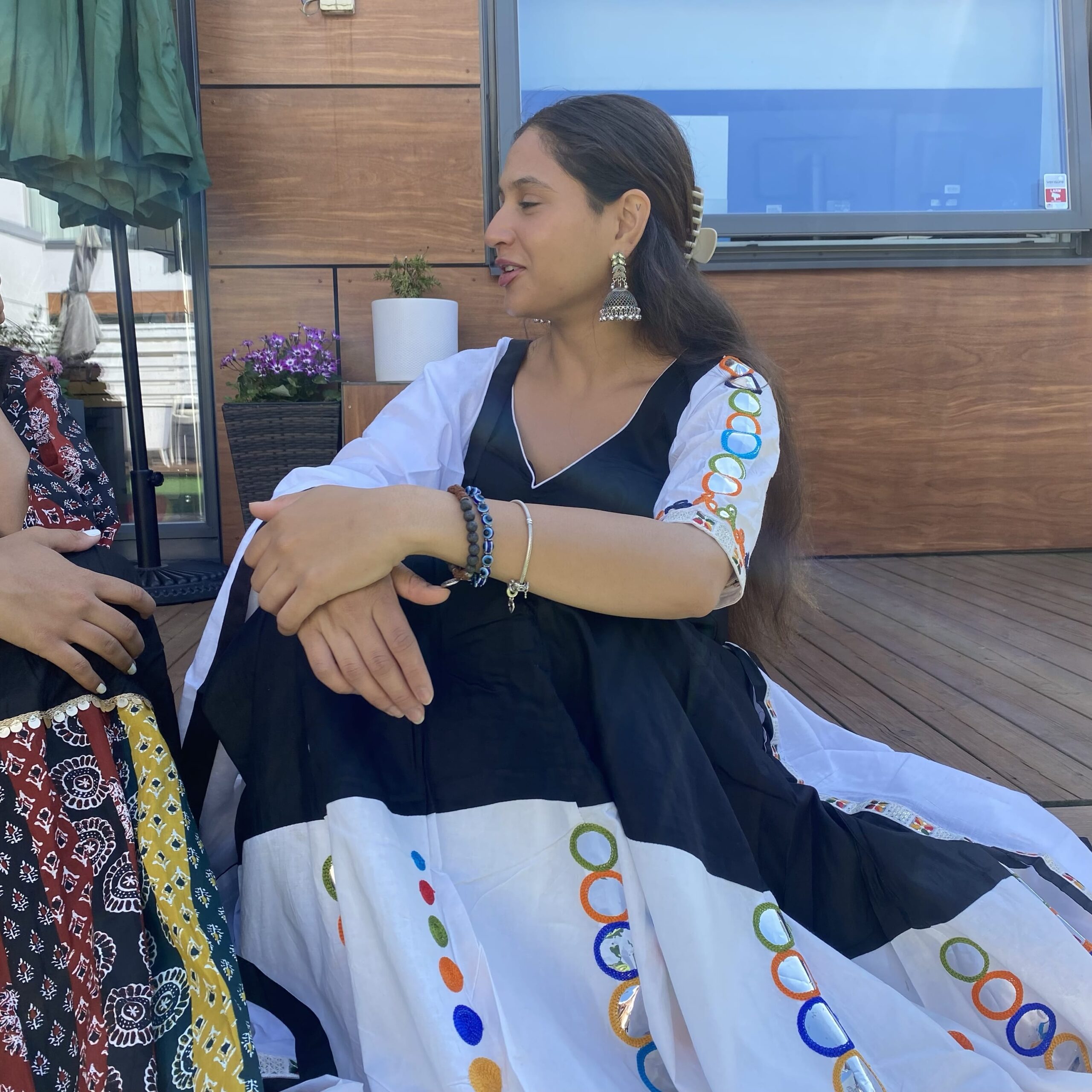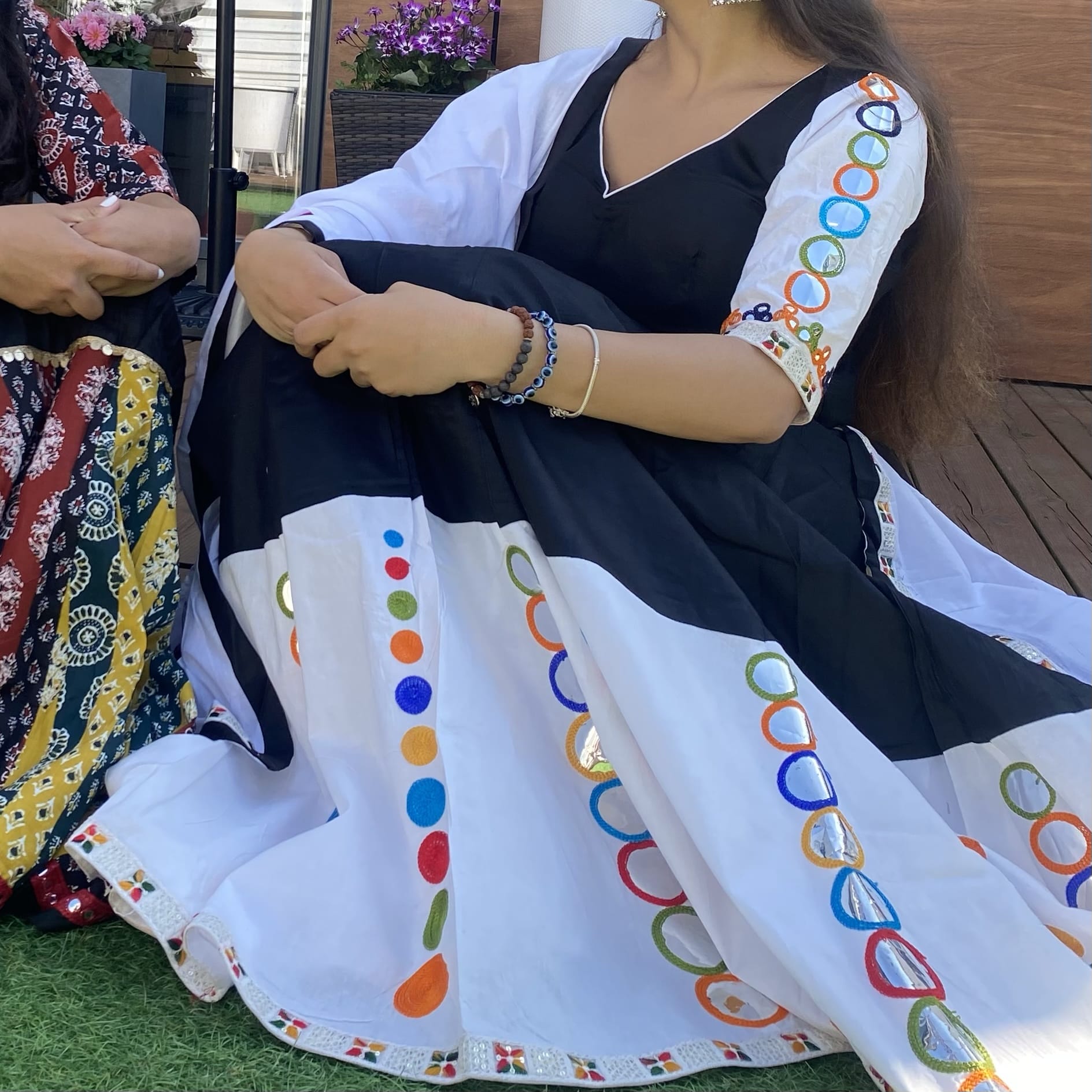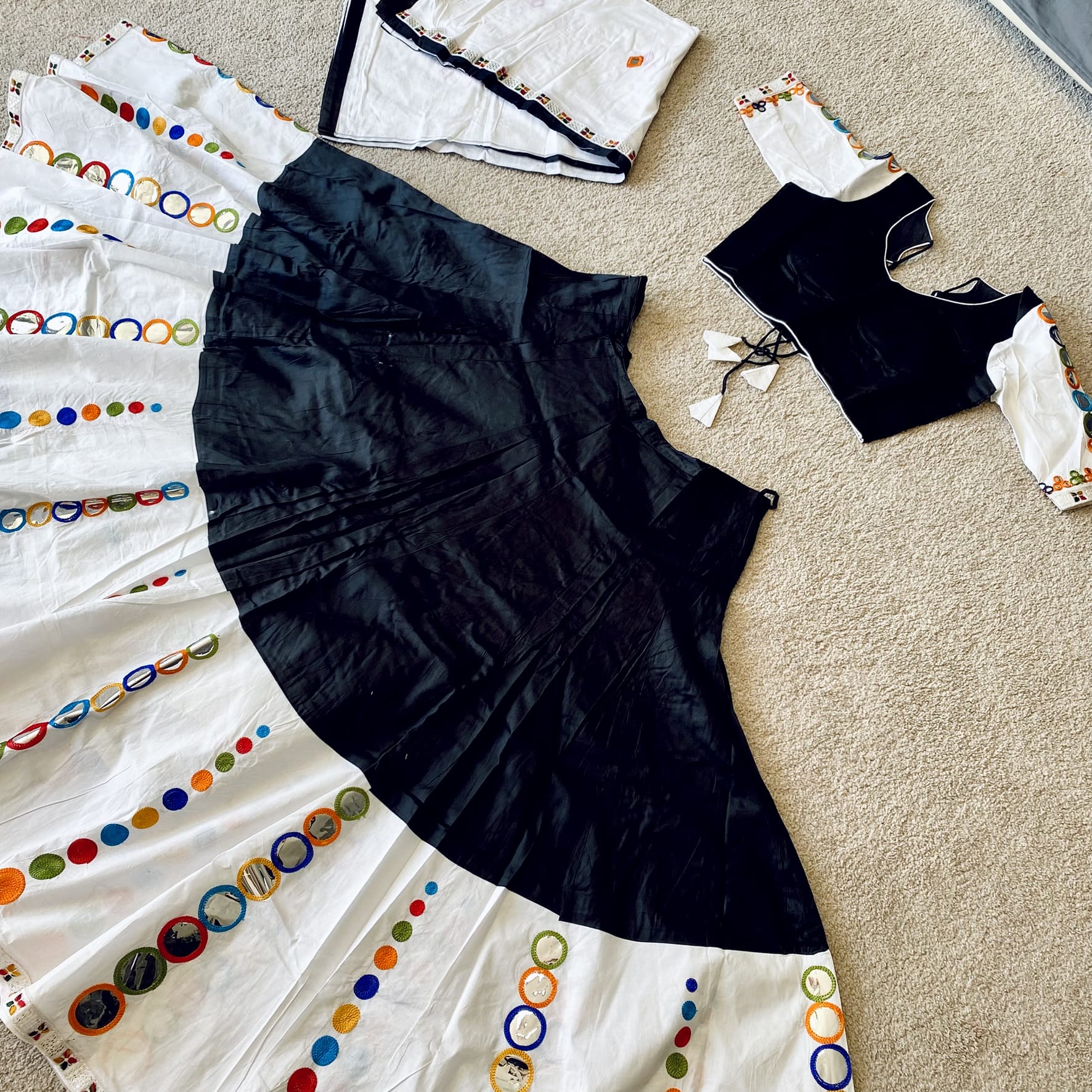 A fully stitched chaniya choli lehenga set with a crisp black and white base and multicolour ring motif detailing that adds a modern festive look. The fabric feels breathable and comfortable, making it suitable for long celebration wear.