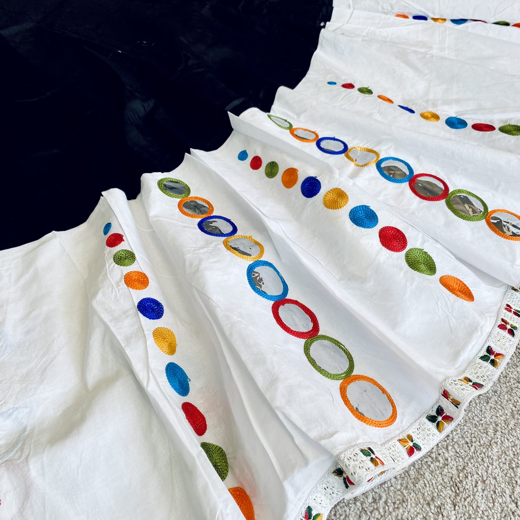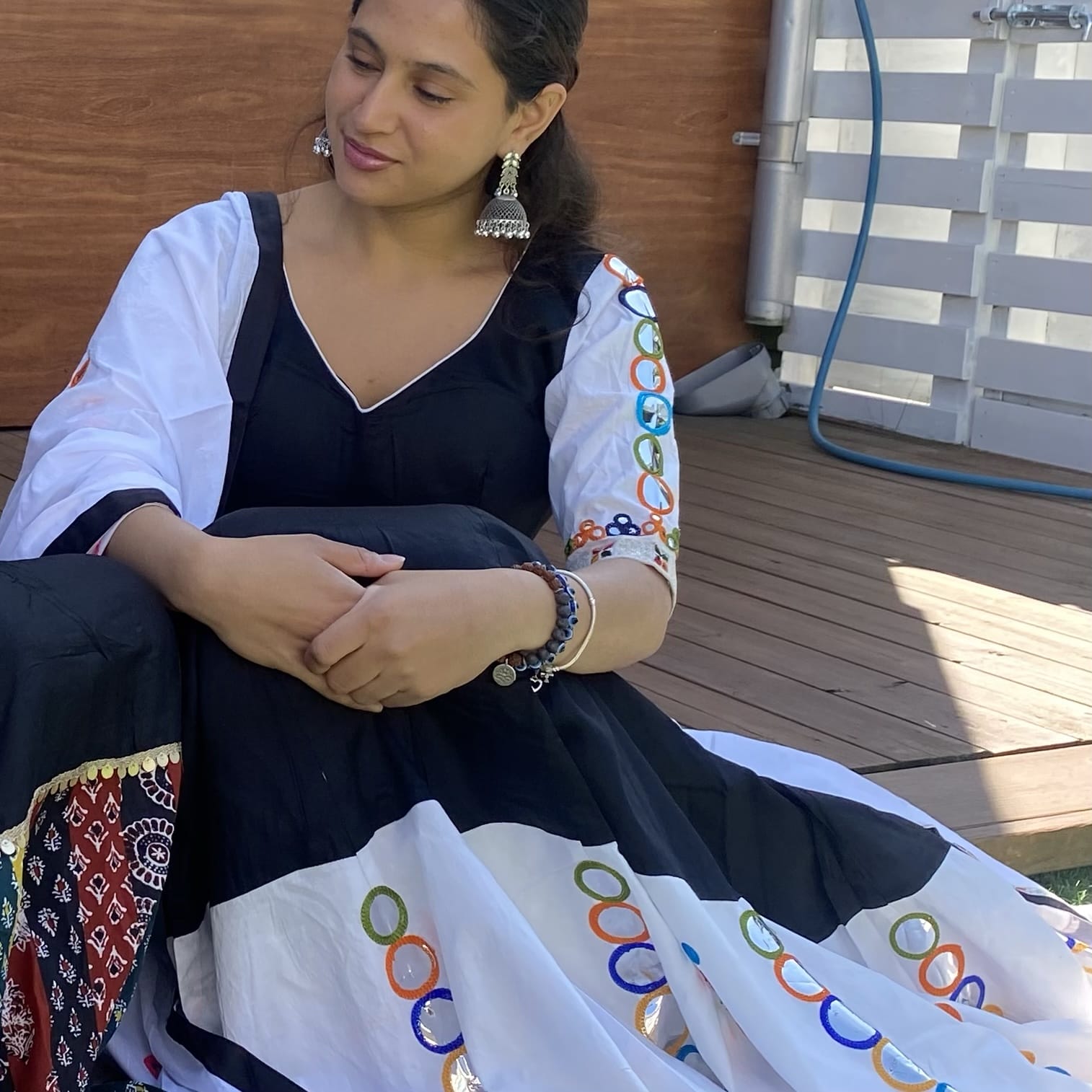 Easy to wear for Garba, Navratri, weddings and festive gatherings, it offers a clean blend of traditional design and contemporary styling. The flared skirt creates graceful movement while the stitched blouse provides a structured and comfortable fit.