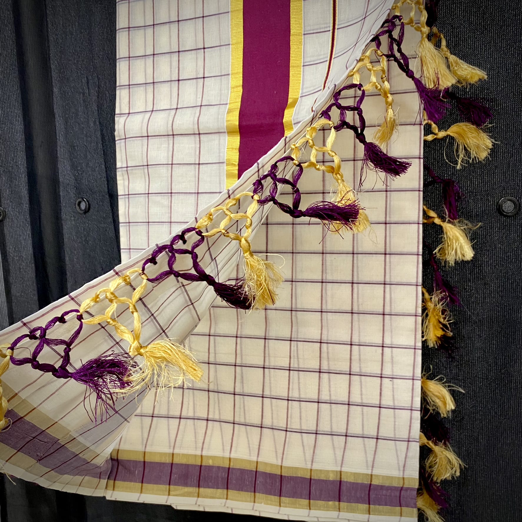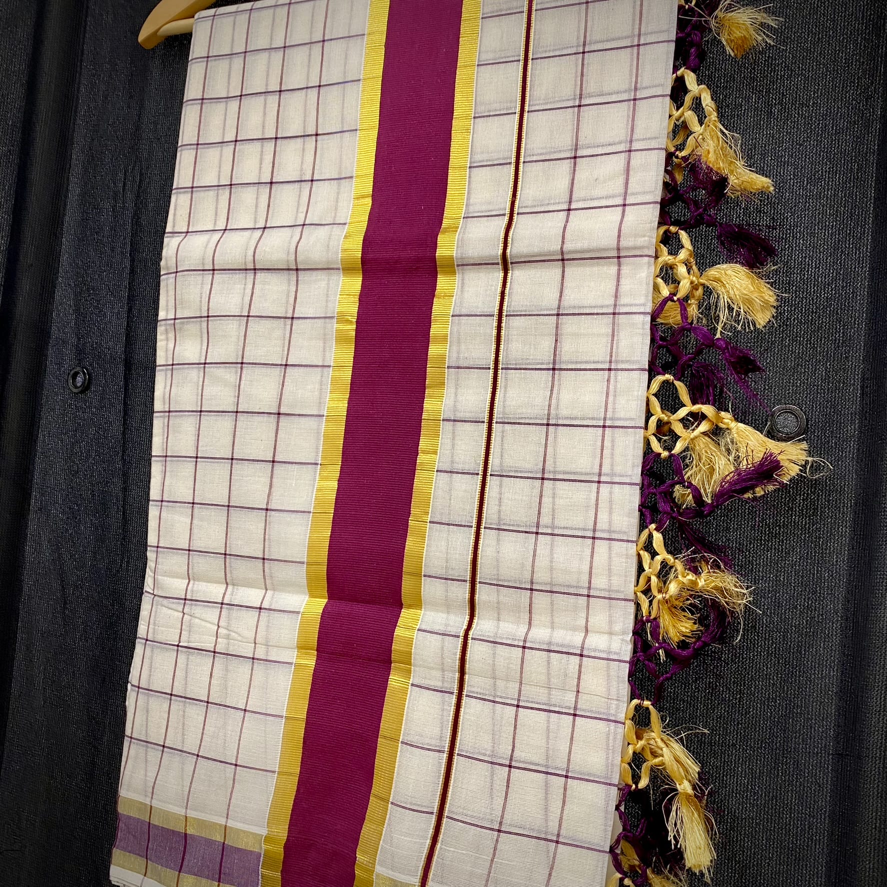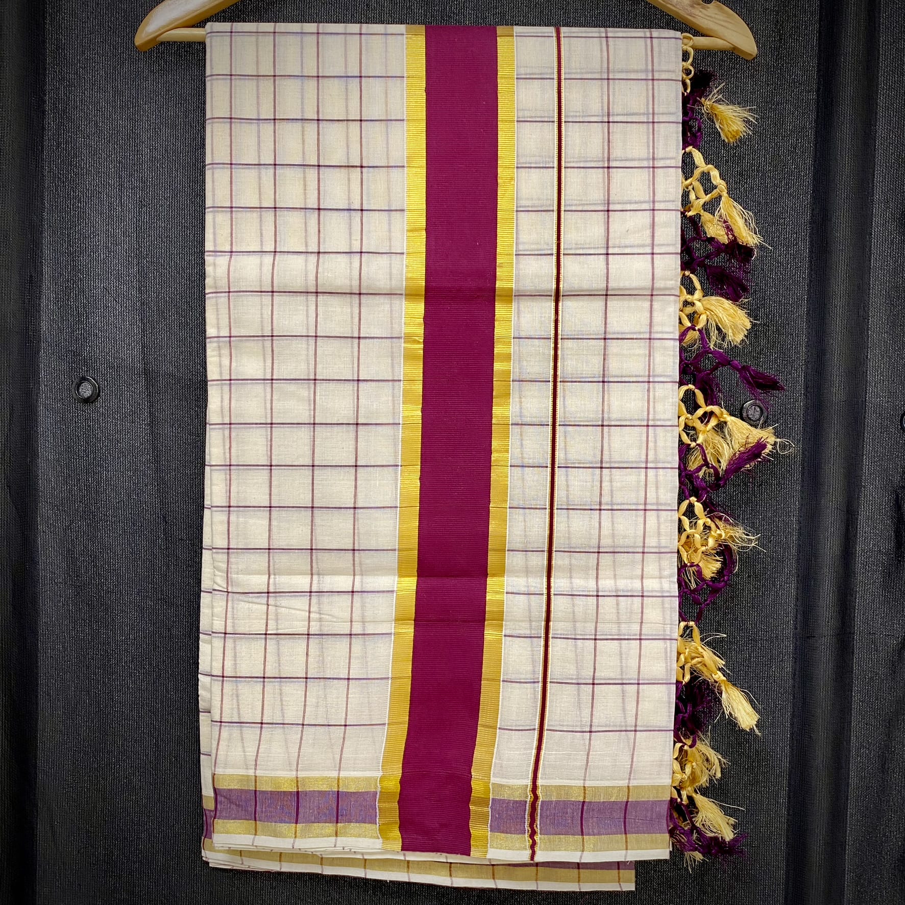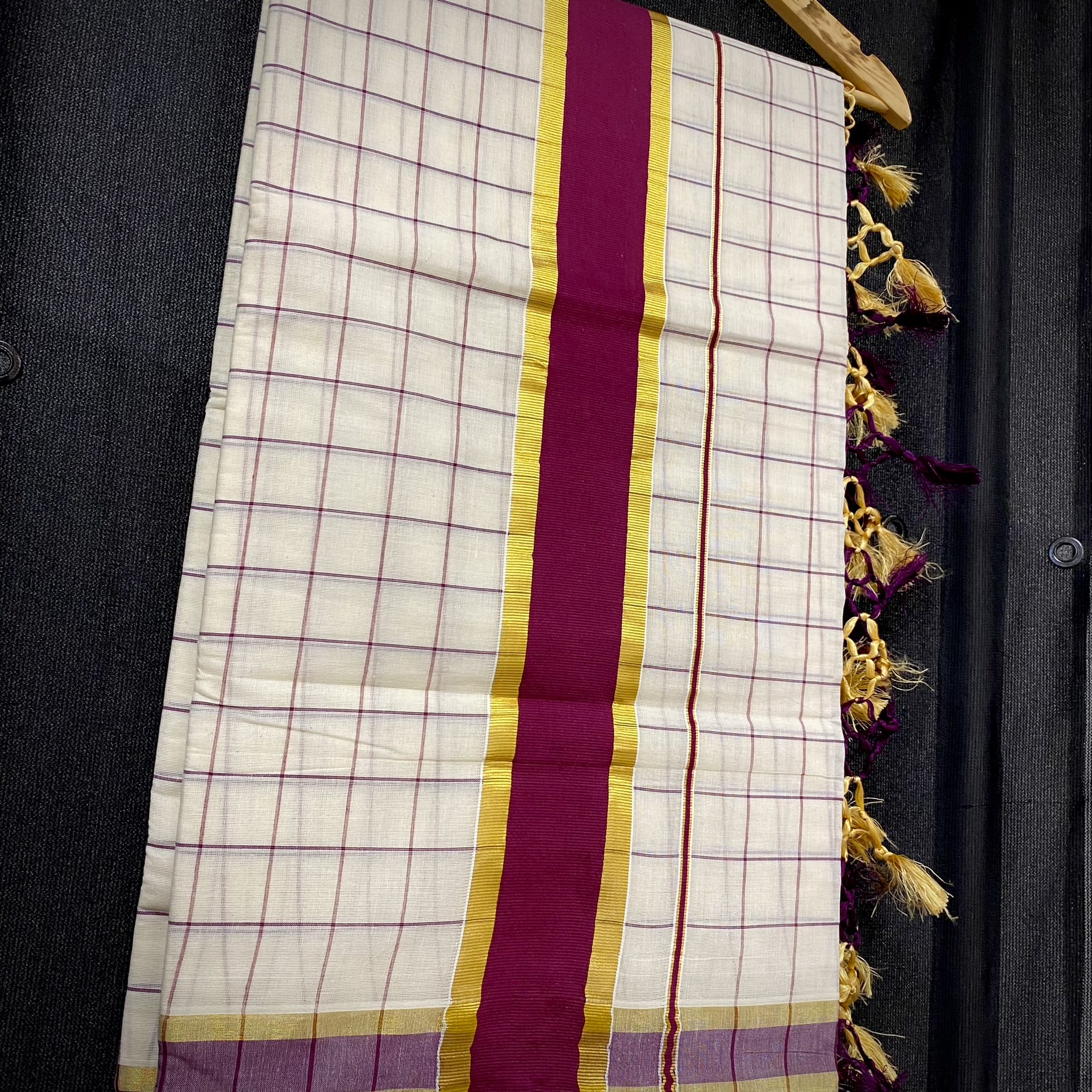 A traditional kasavu saree in off white with classic gold zari and deep maroon border, reflecting the timeless elegance of Kerala craftsmanship. This saree is an authentic weave of our talented artisans from Palakkad, Kerala.