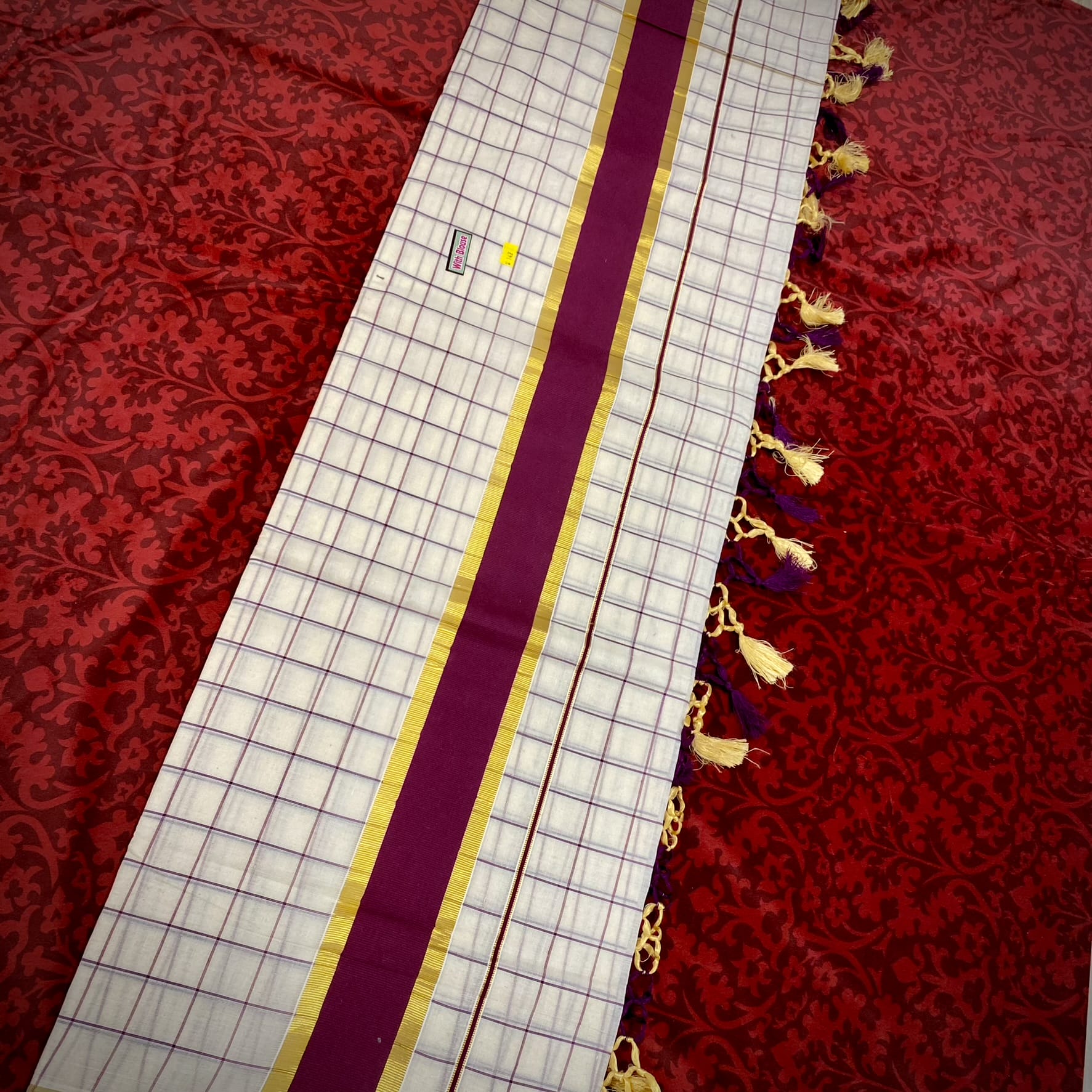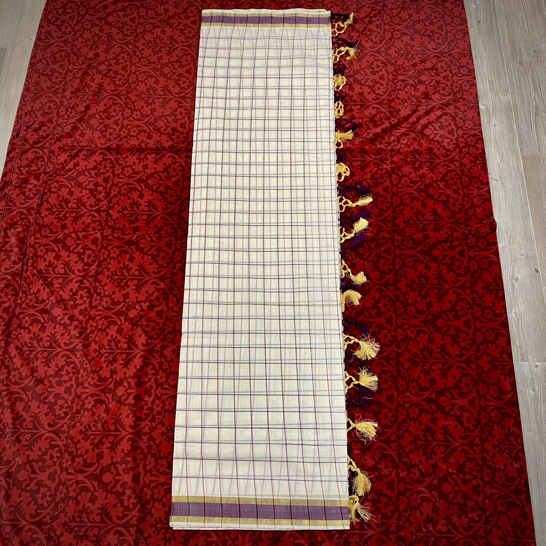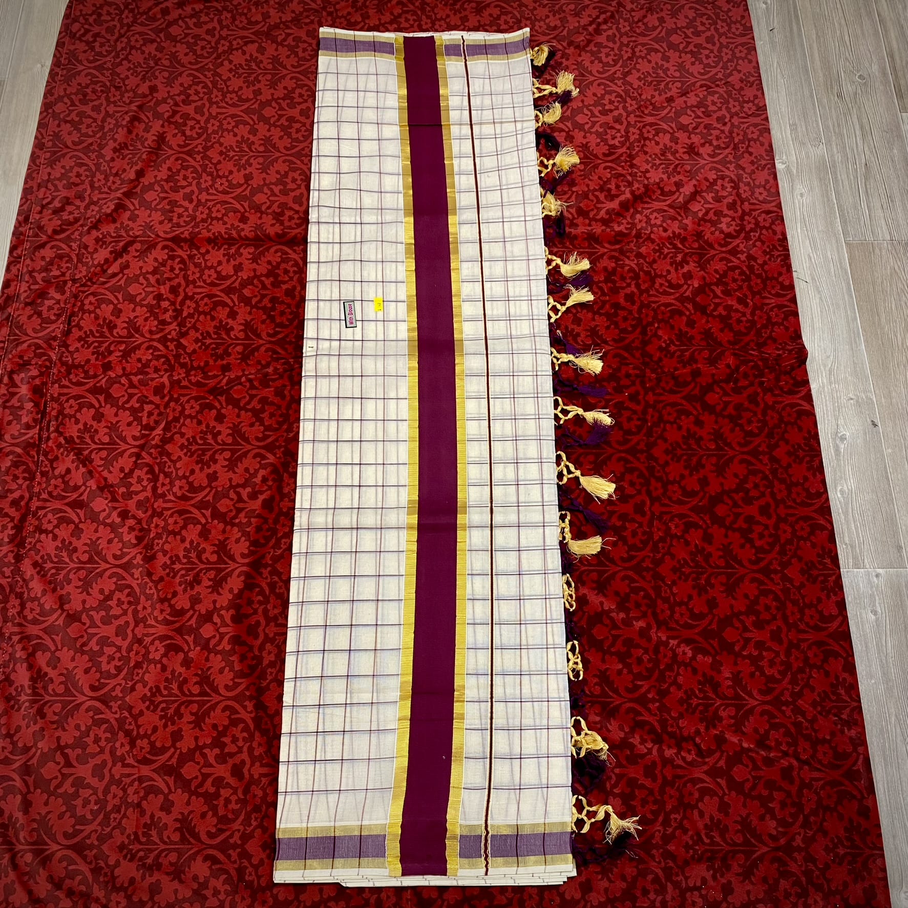 Lightweight and comfortable, it is perfect for cultural celebrations, festivals and special occasions. The subtle check pattern combined with the rich maroon border creates a refined and graceful look suitable for both traditional and modern styling.