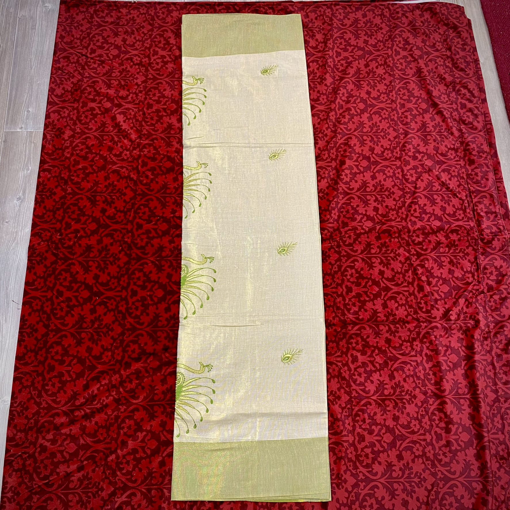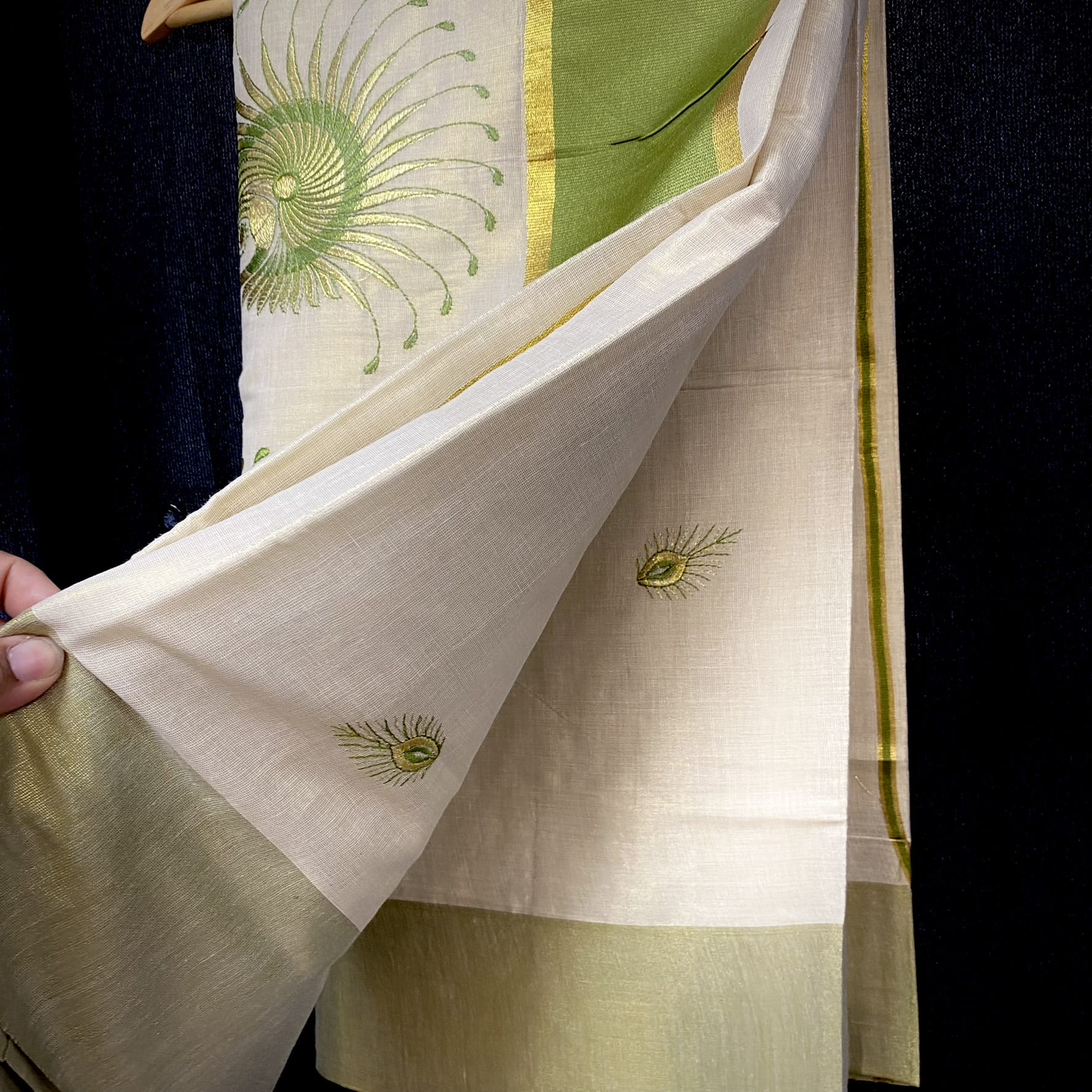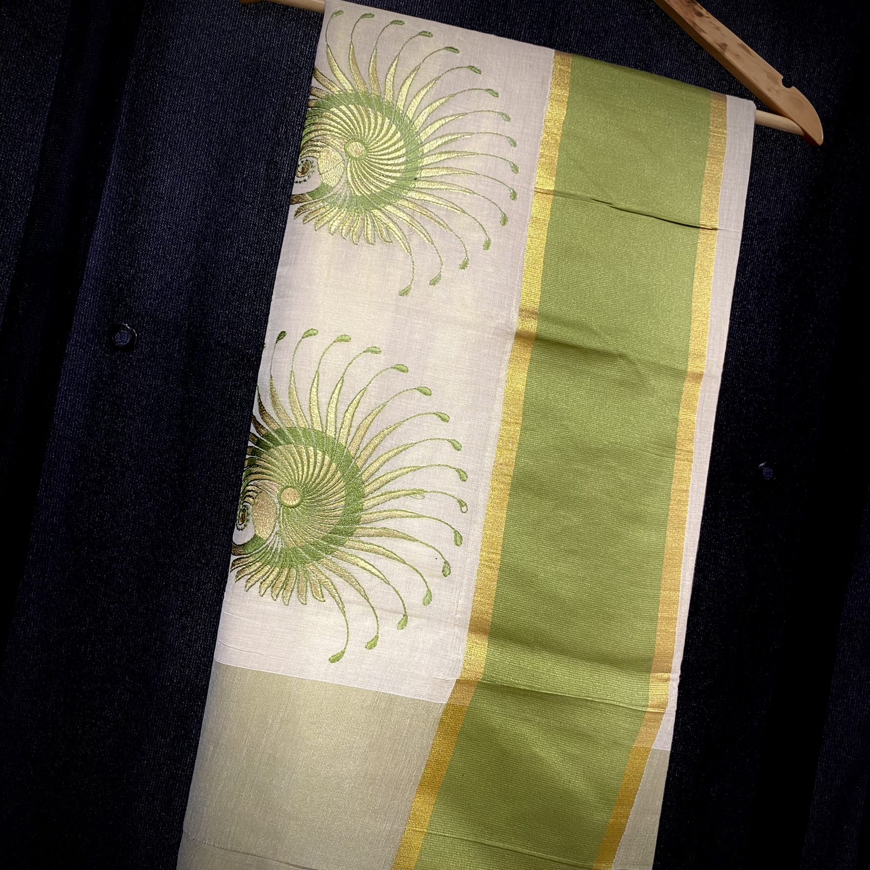 Crafted in soft cotton with a light sheen, it offers a breathable and comfortable drape, perfect for festive occasions, cultural gatherings and refined day wear. The delicate green detailing adds a unique artistic touch while maintaining the purity of the kasavu tradition.