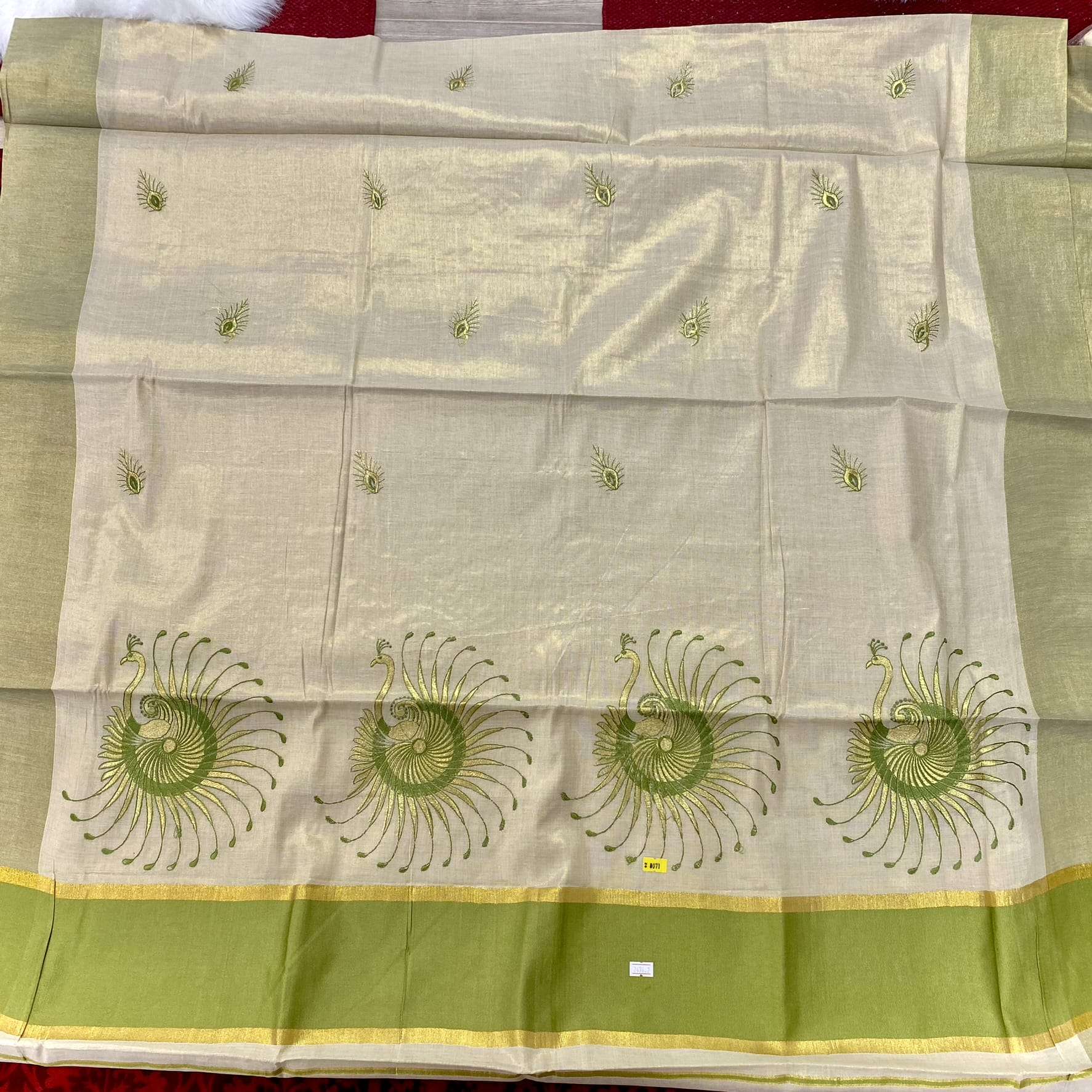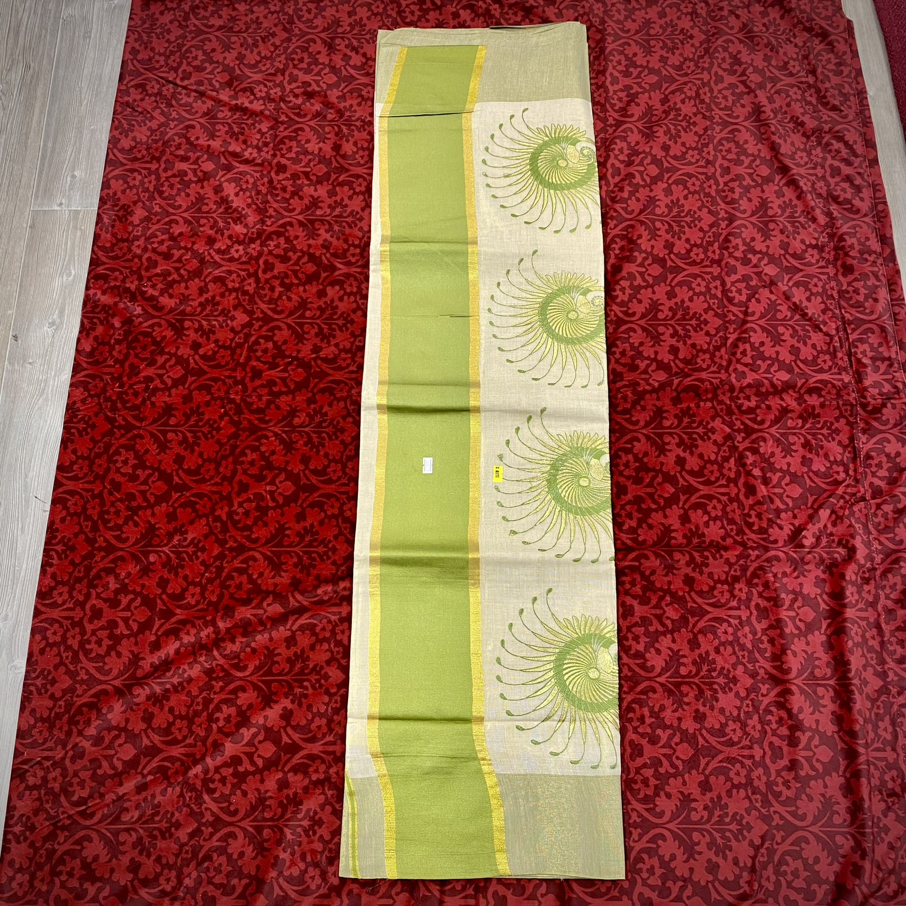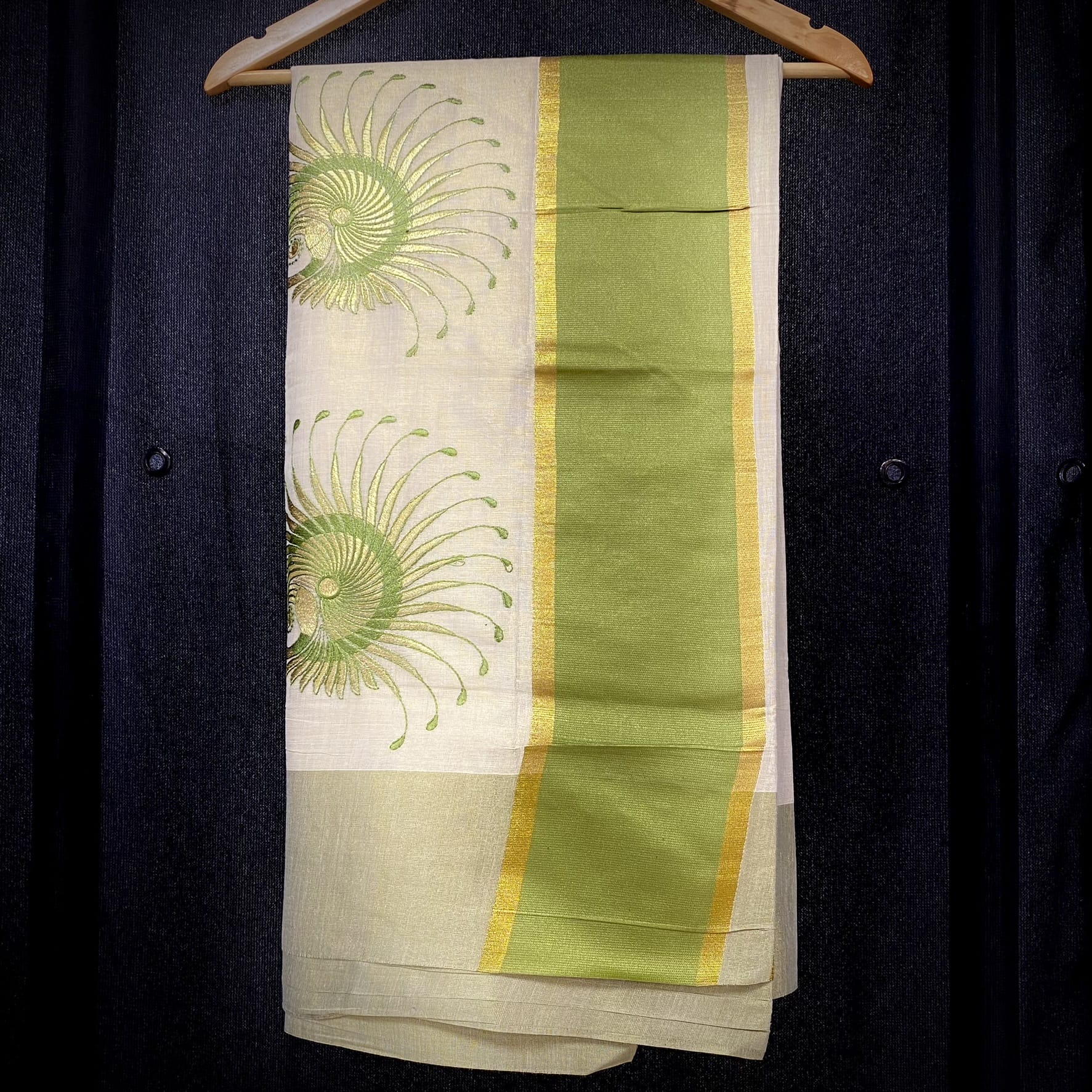 Kasavu Saree – Off White with Green Motifs and Gold Border