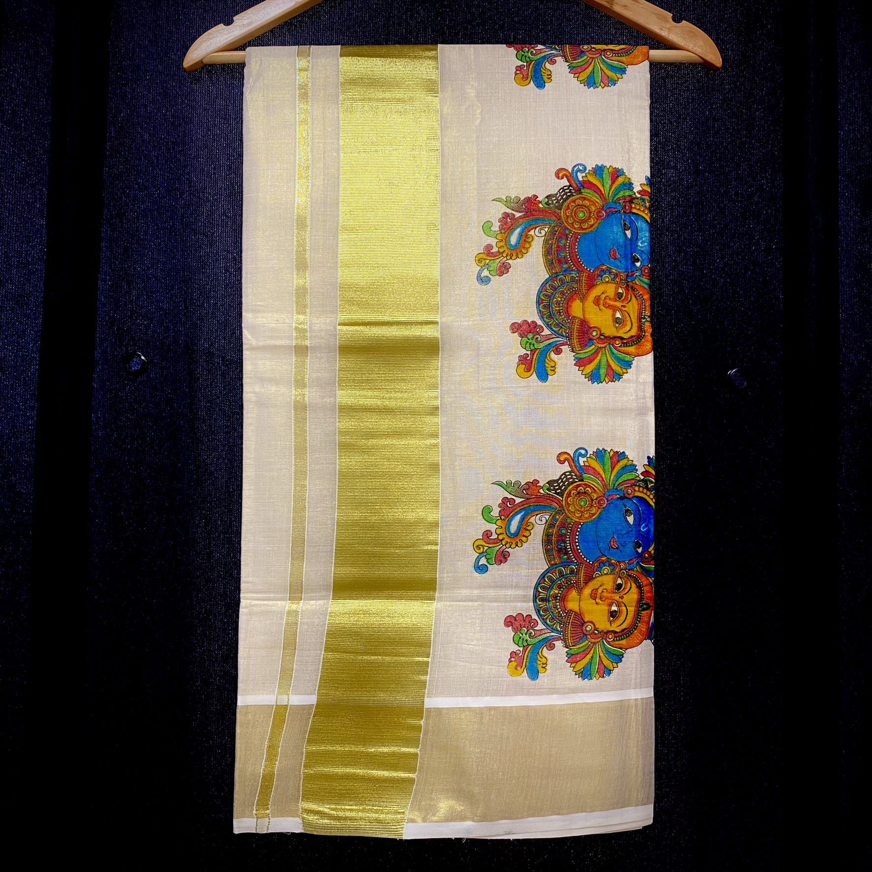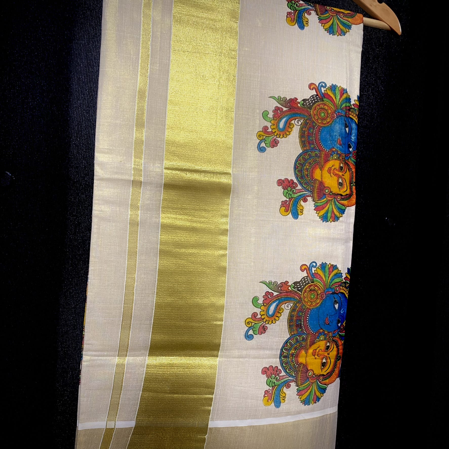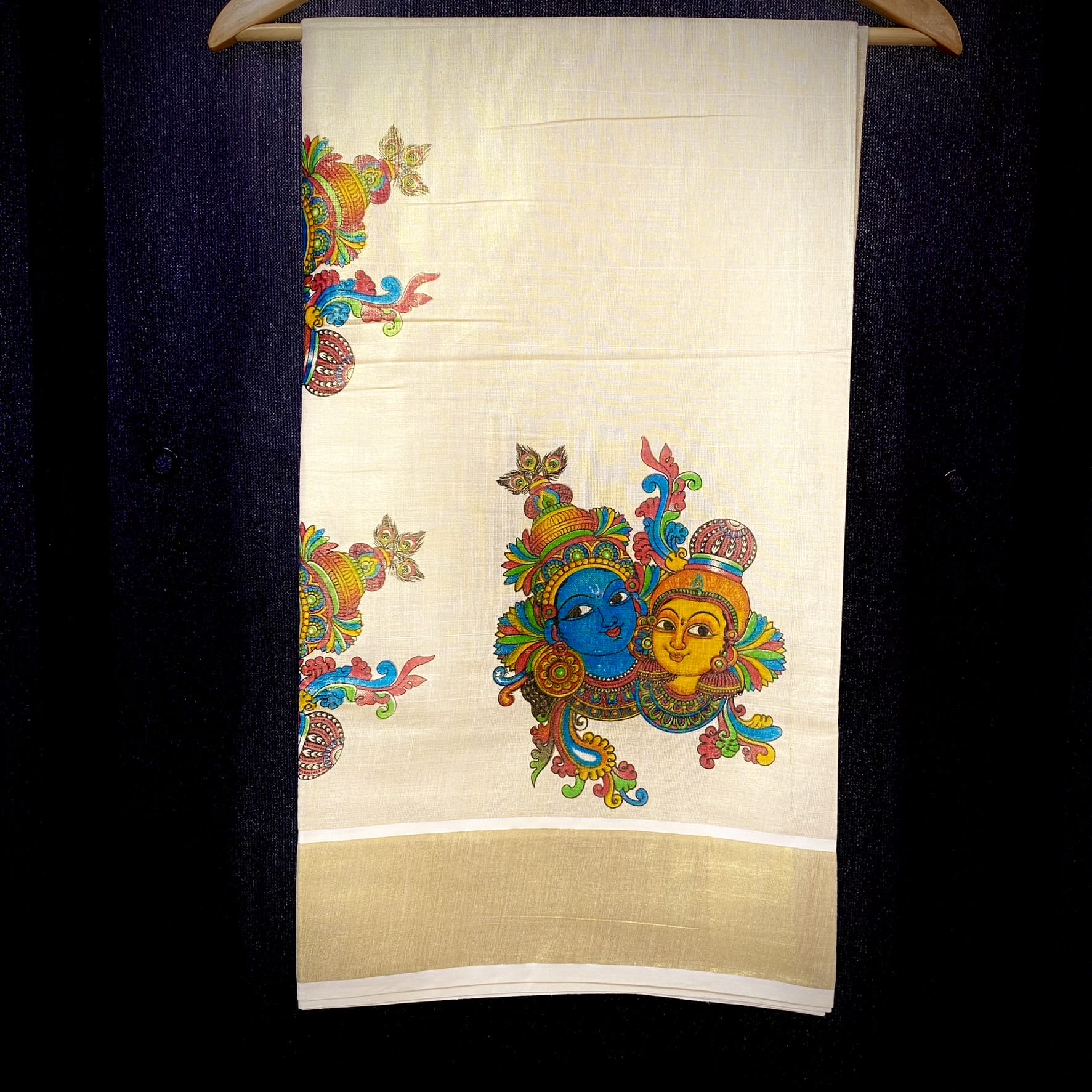 Kasavu Saree – Off White with Mural Art and Gold Border