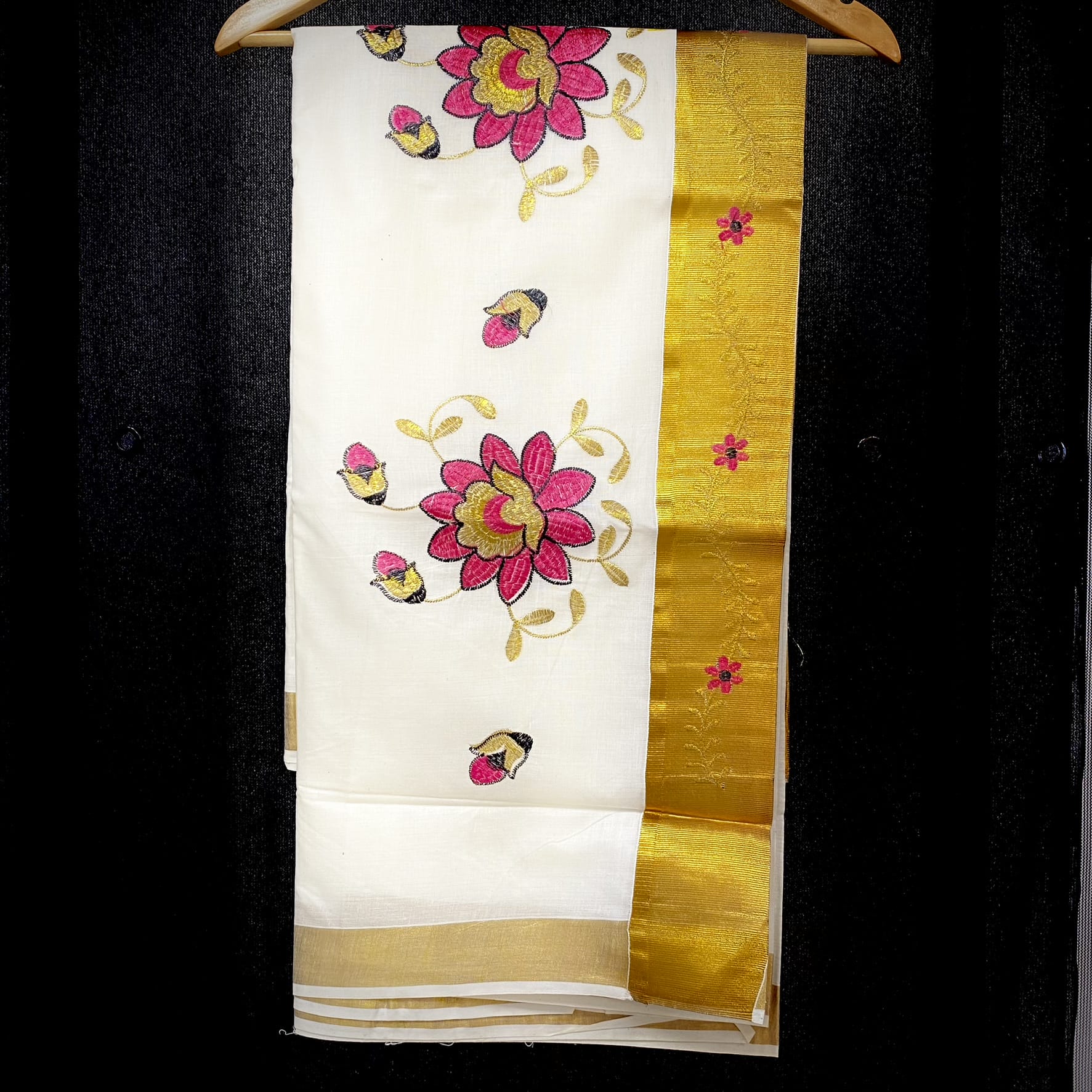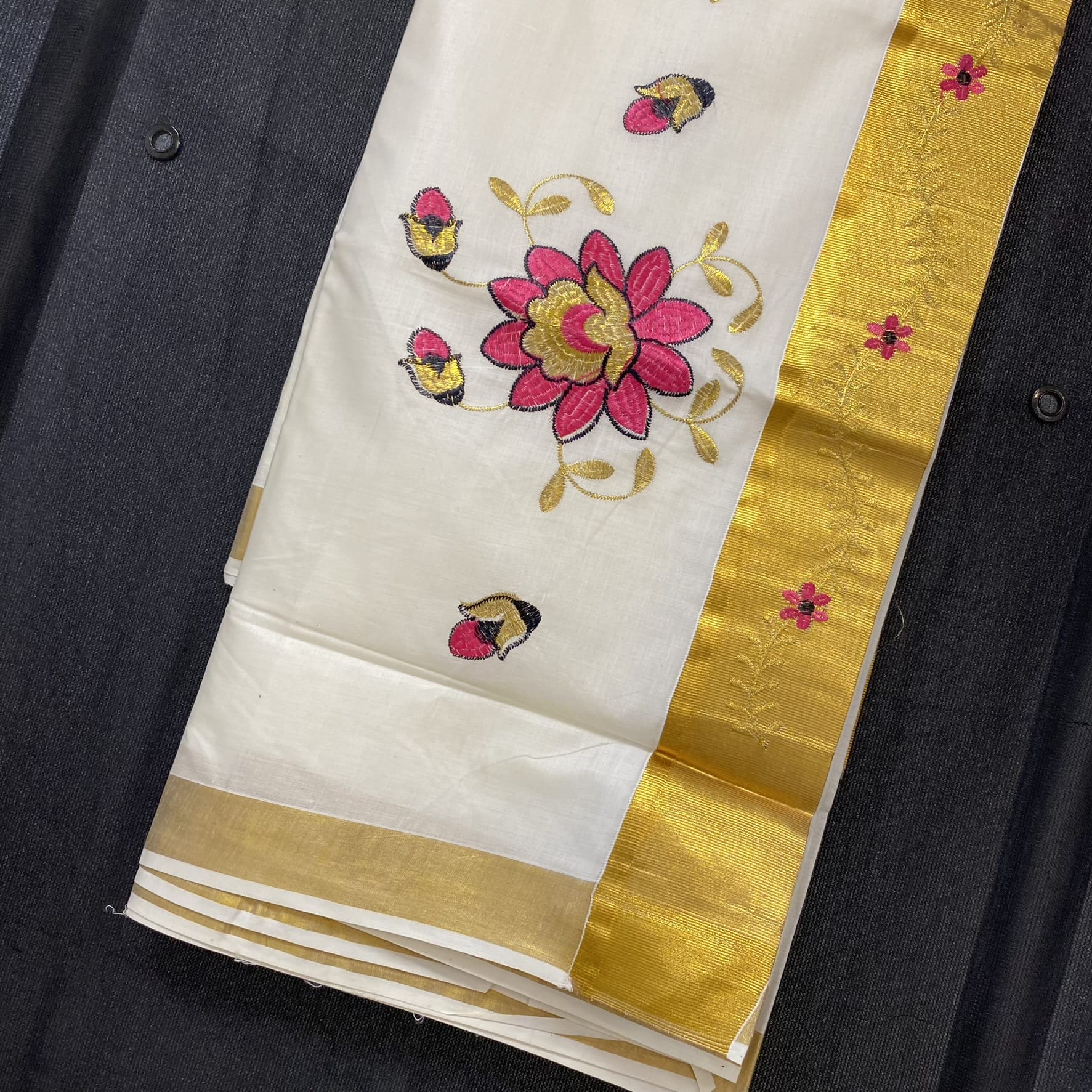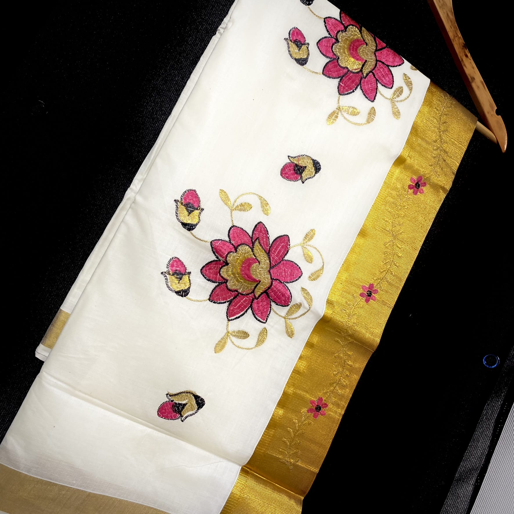 Work: Floral embroidery with gold kasavu border and scattered motifs