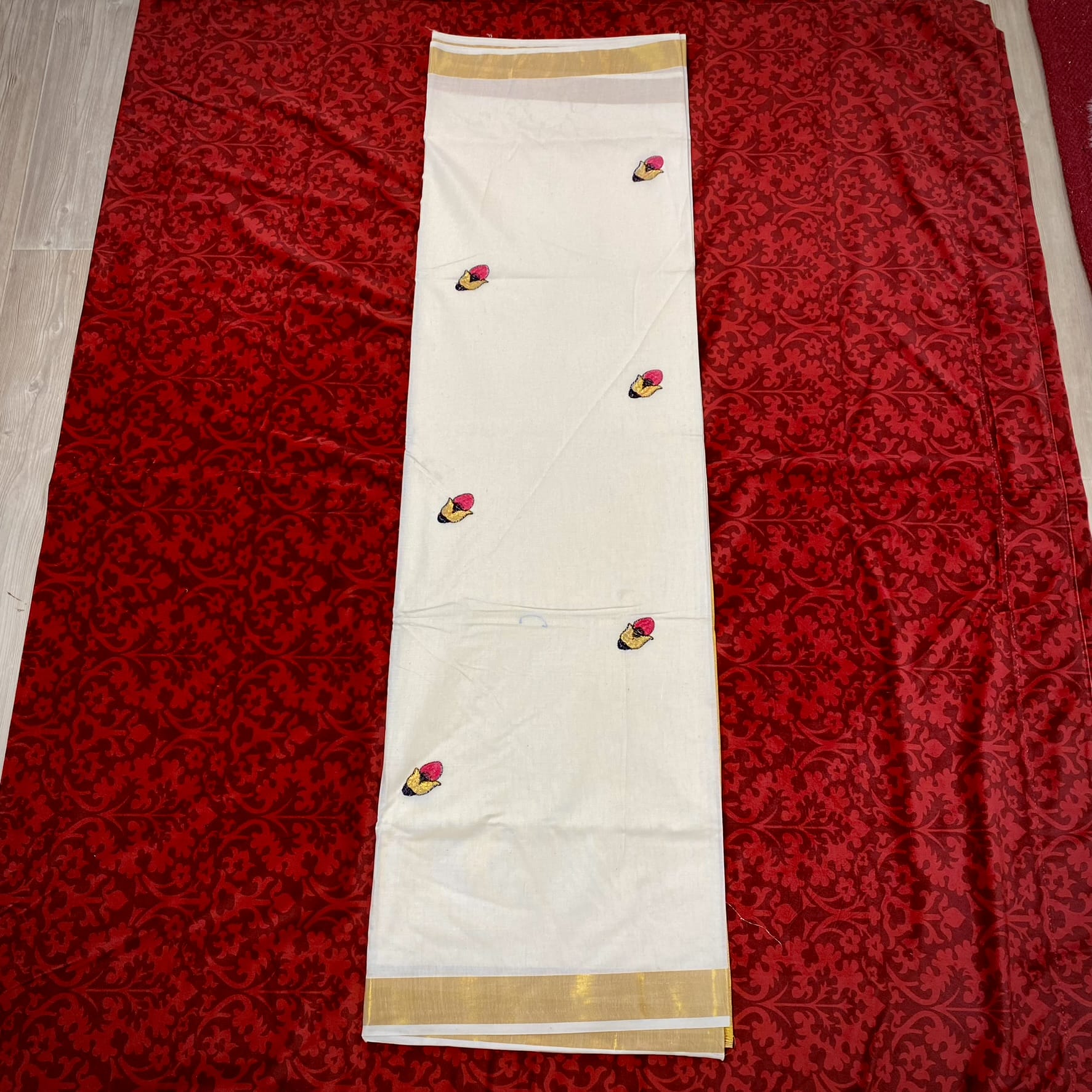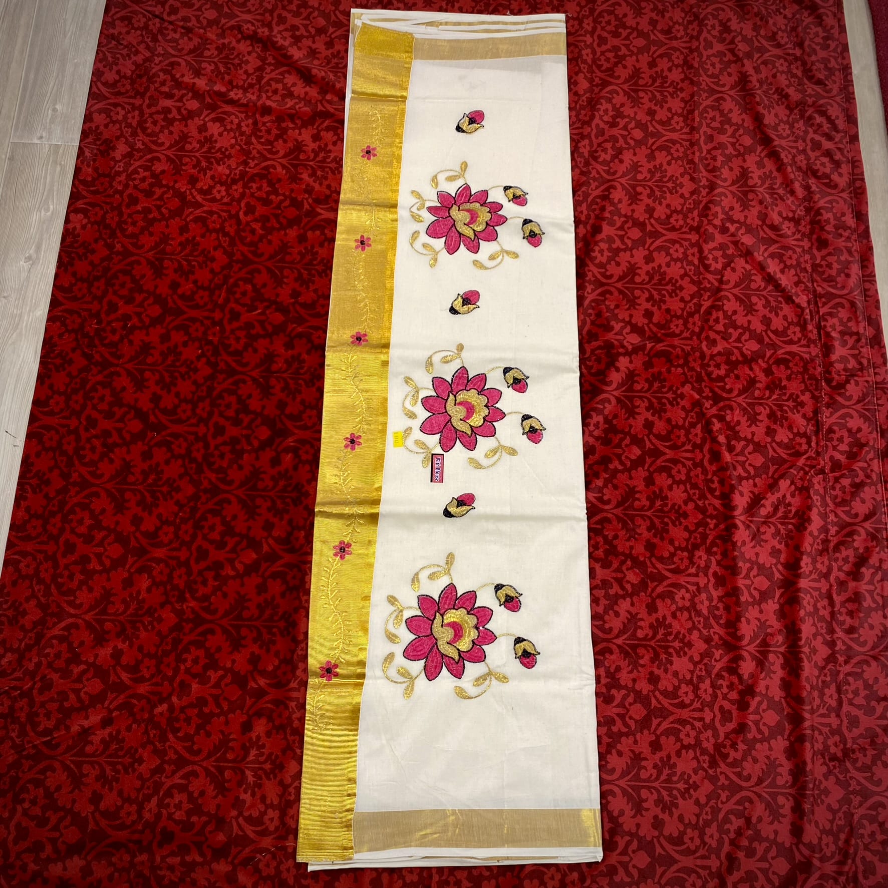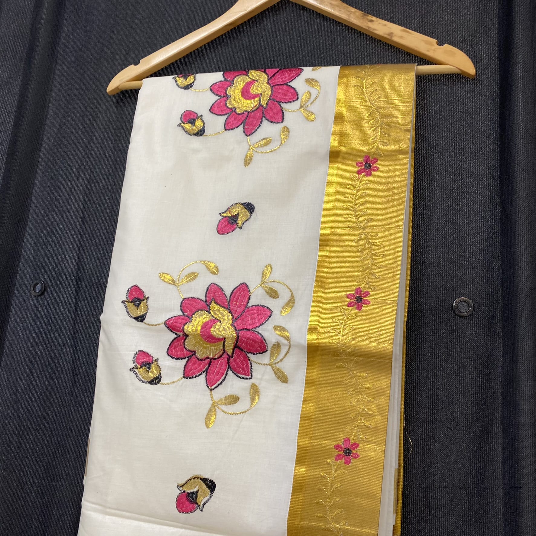 Work: Floral embroidery with gold kasavu border and scattered motifs