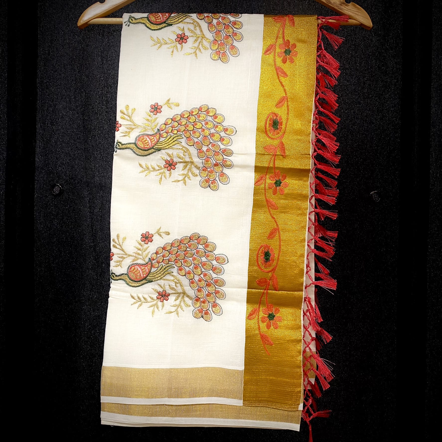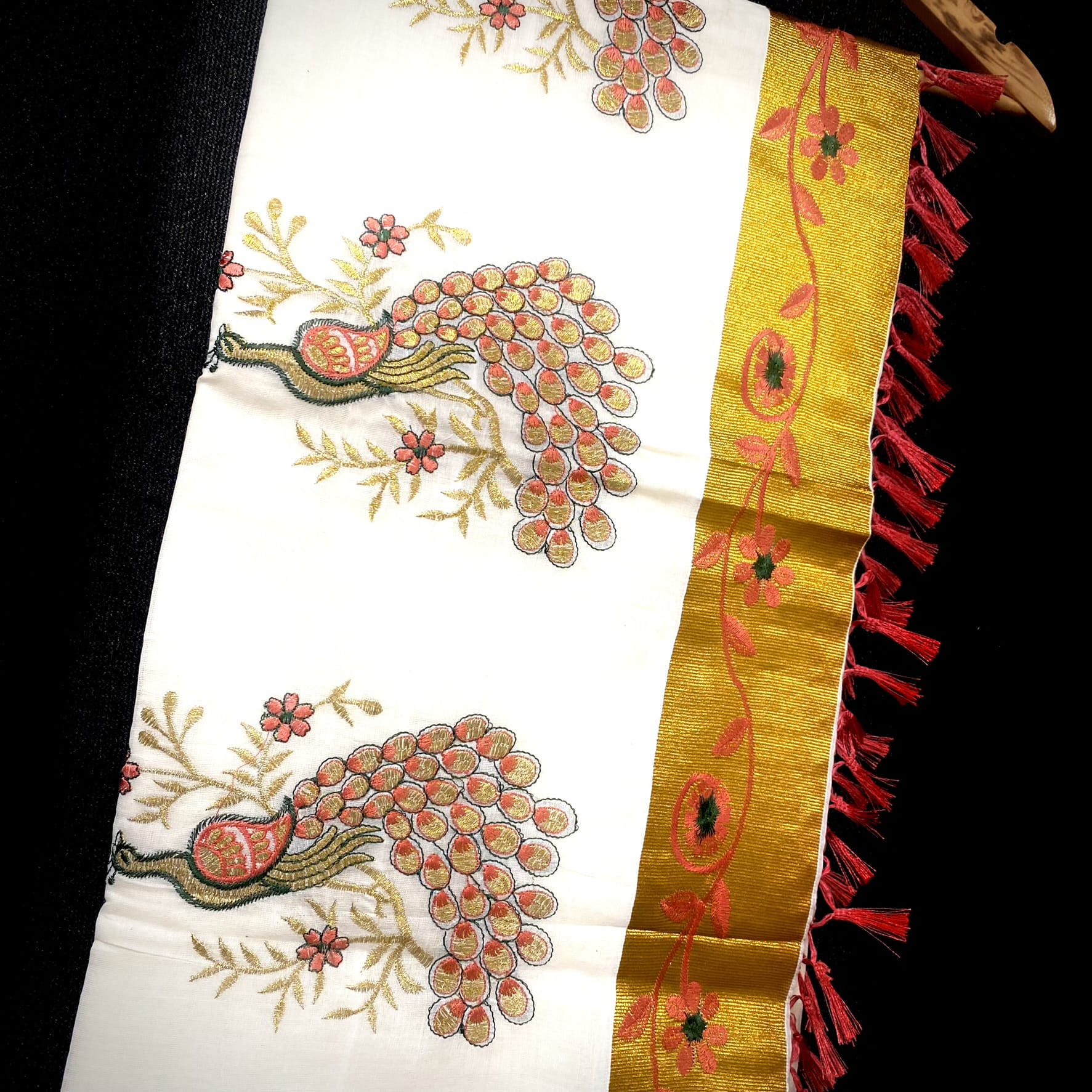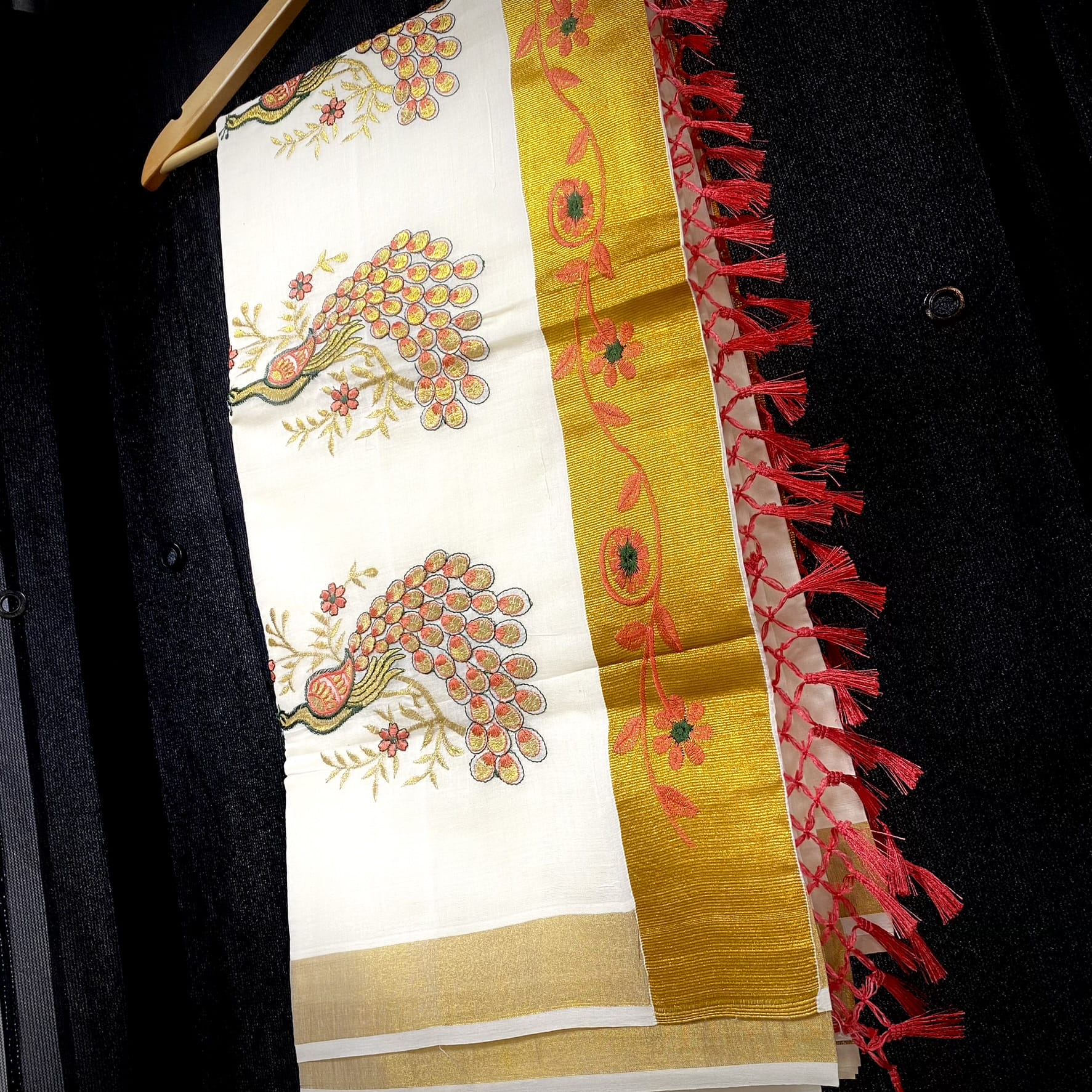 Crafted in soft cotton, the saree blends traditional Kerala aesthetics with artistic design elements, making it perfect for festive occasions, cultural events and celebrations. The intricate peacock detailing adds a graceful and eye-catching charm while maintaining the classic kasavu elegance.