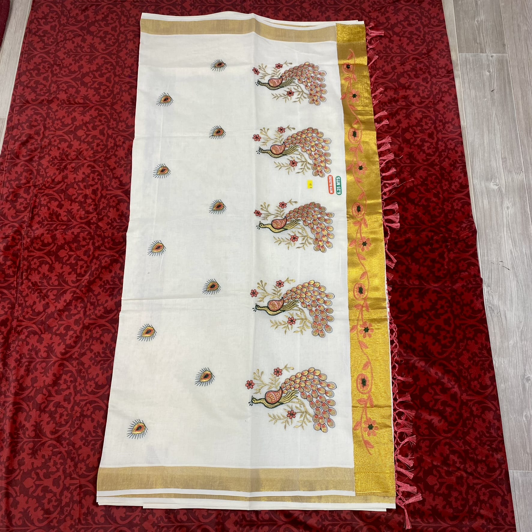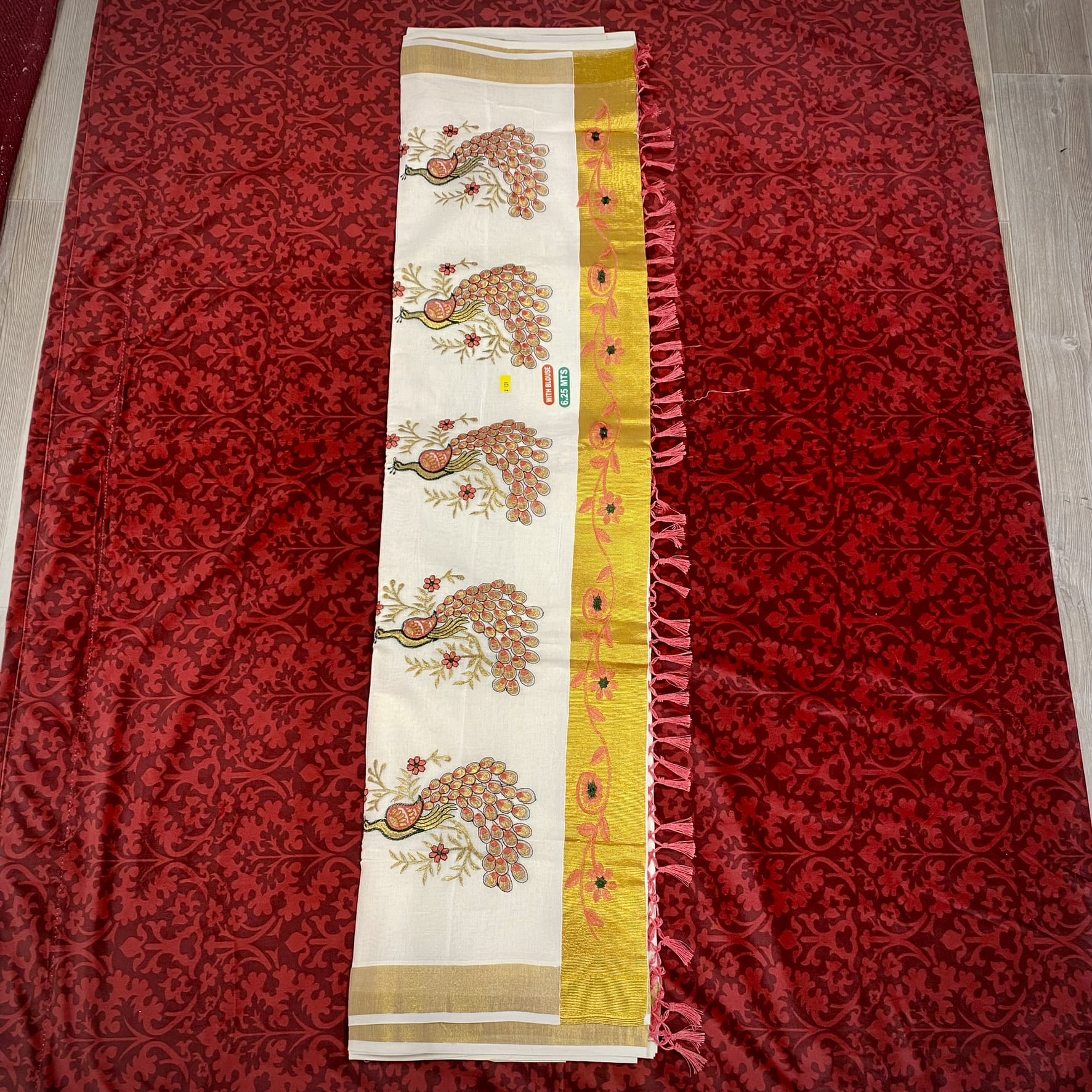 Work: Peacock motifs with gold kasavu border and contrast pallu