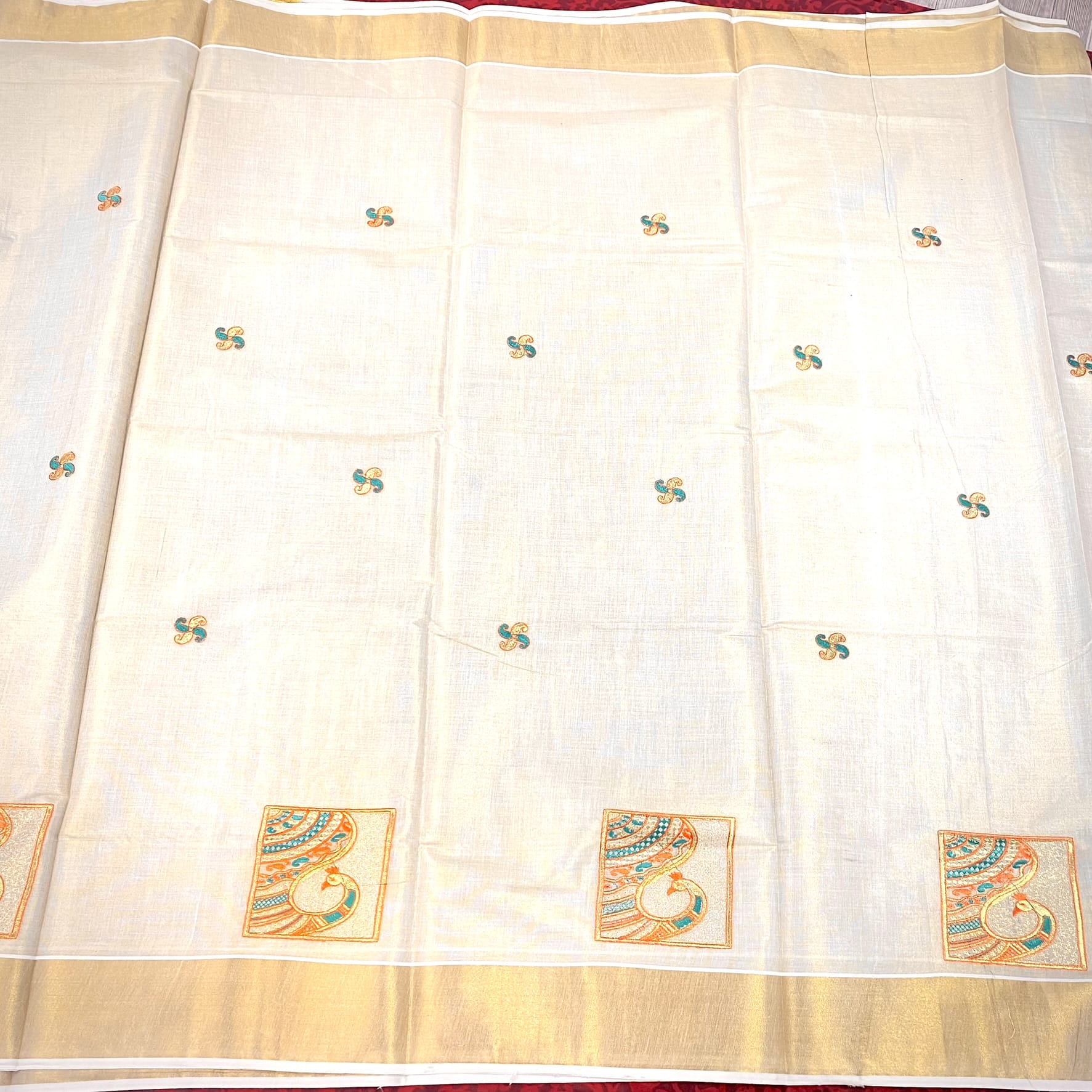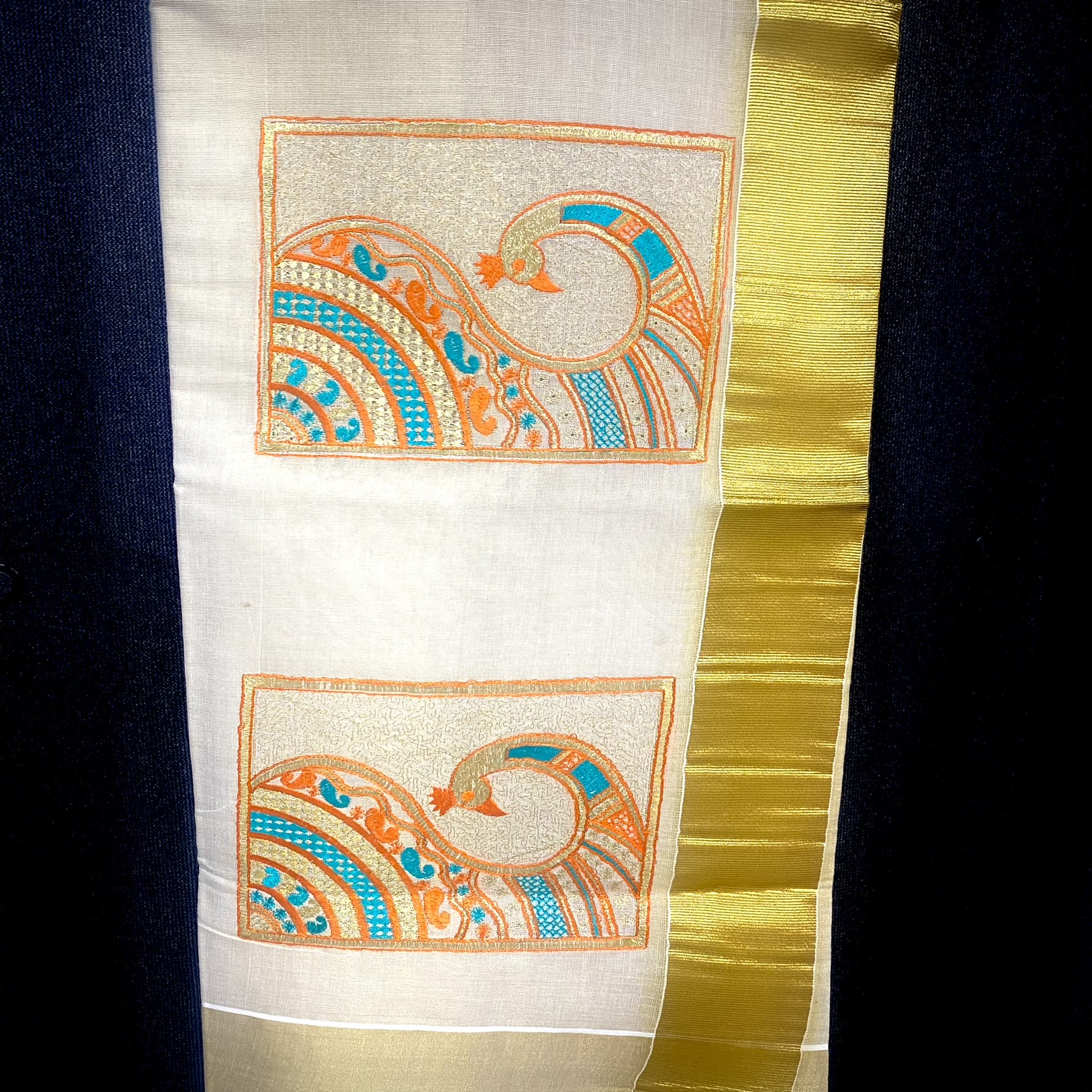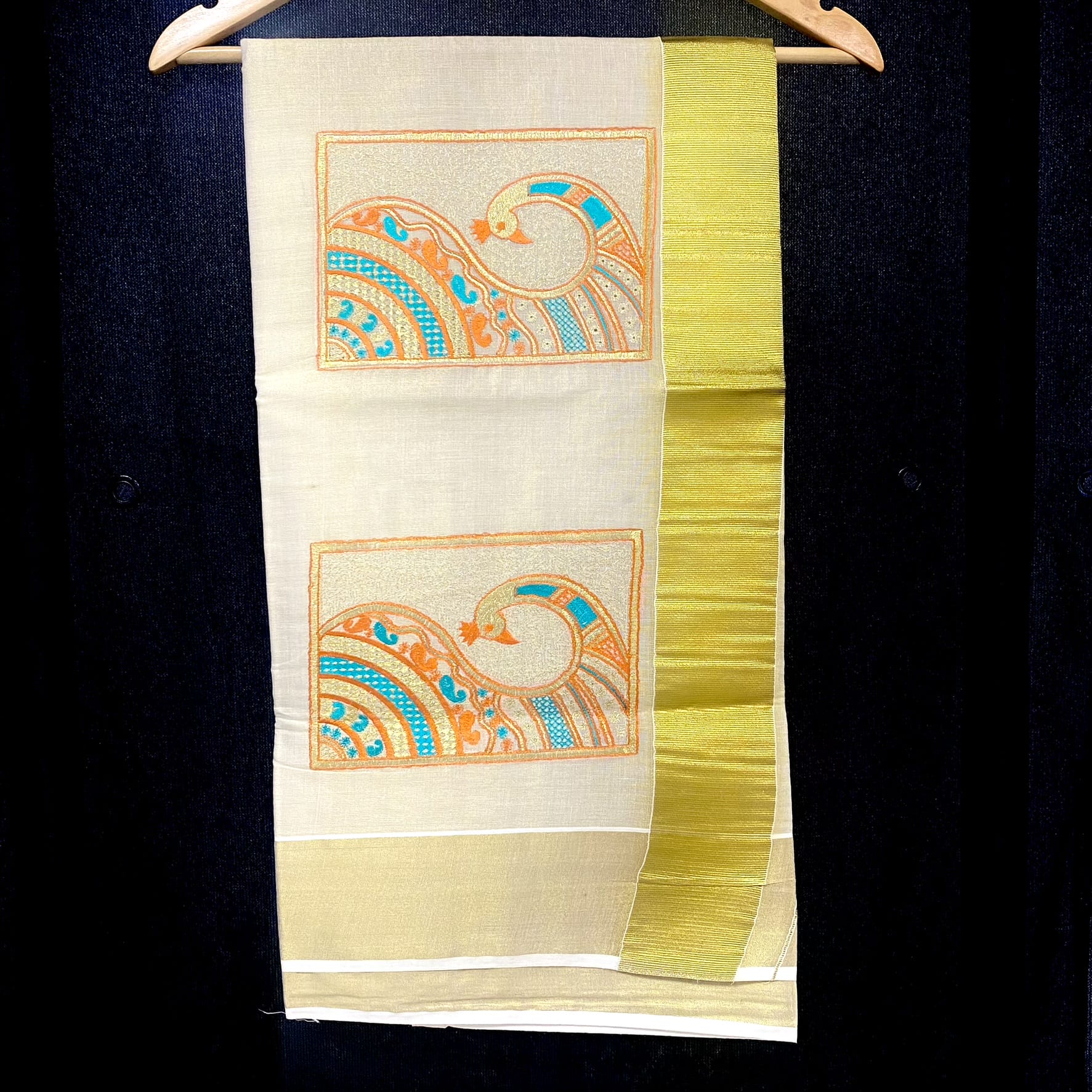 Crafted in fine cotton tissue, this saree blends traditional Kerala elegance with a modern designer touch. The structured panel design with peacock-inspired detailing adds a unique and contemporary character while keeping the saree graceful and festive.