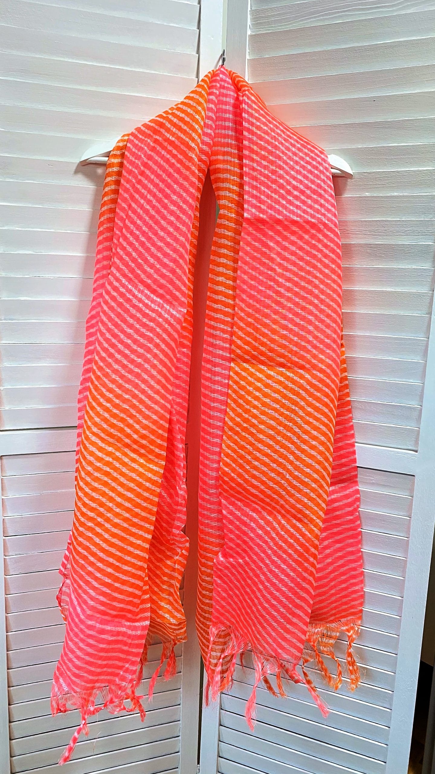A vibrant Leheriya tie-dye dupatta scarf featuring a beautiful sunrise-inspired blend of pink and orange tones. The traditional diagonal Leheriya pattern adds a lively and dynamic appeal, making it a perfect accessory to brighten up any outfit.