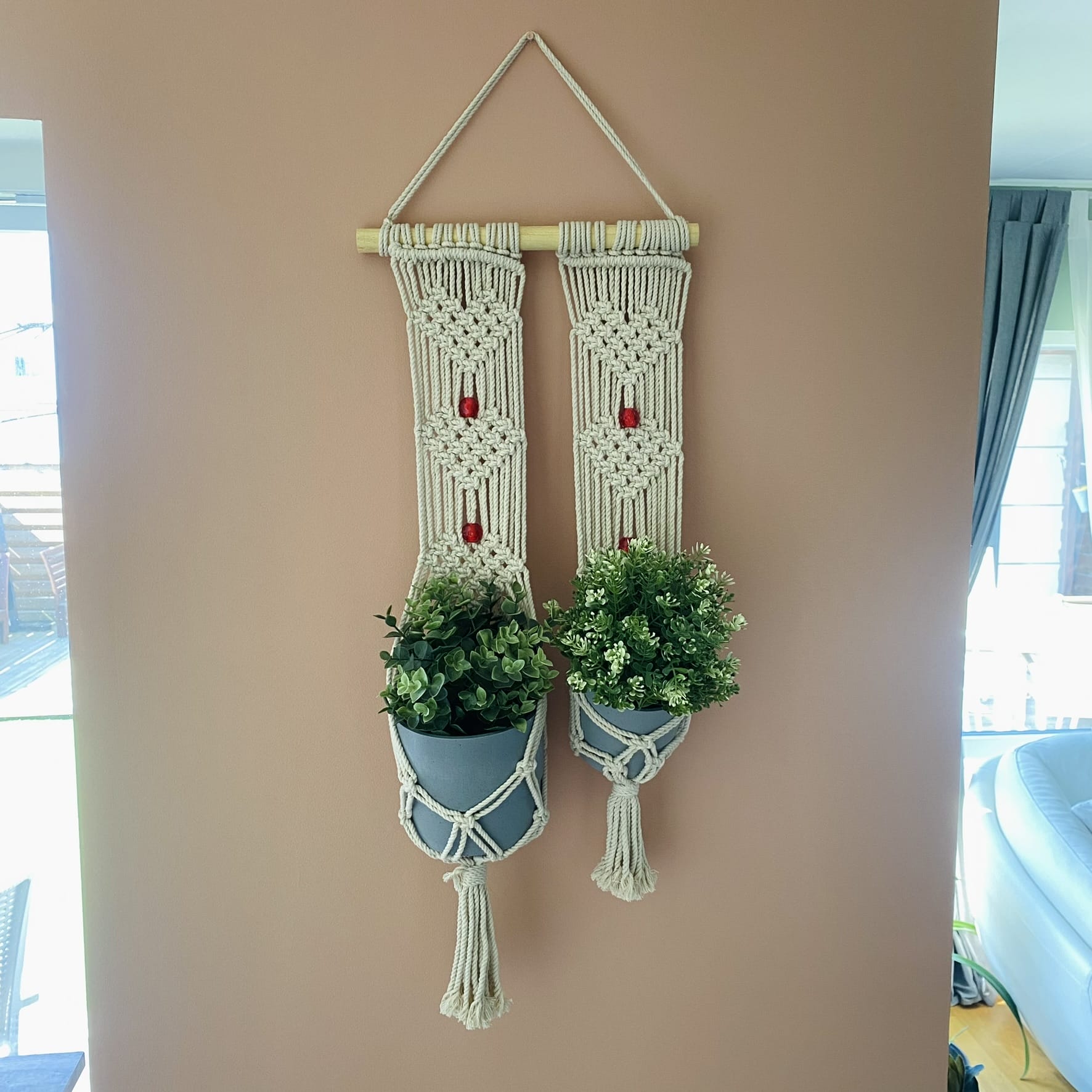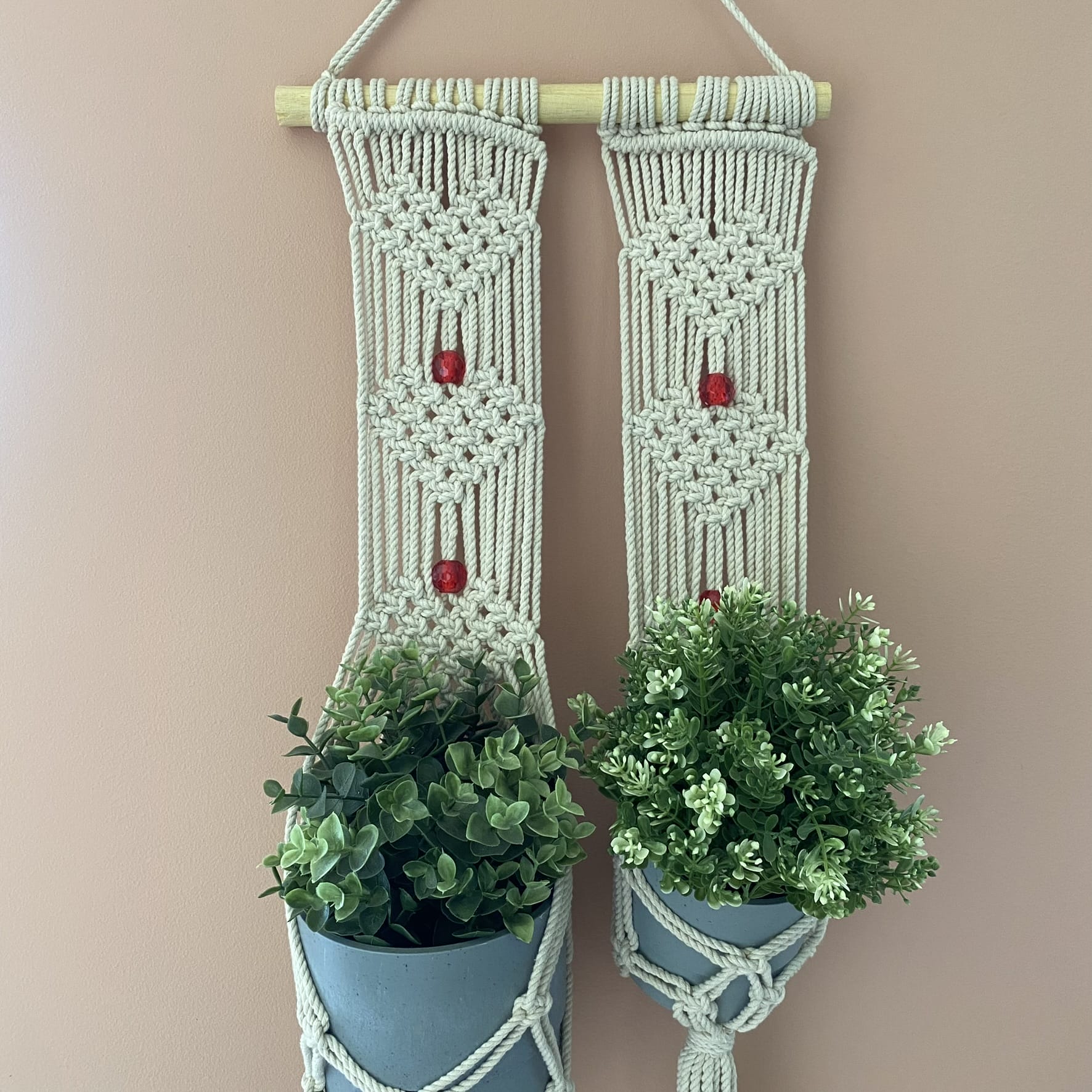 Handwoven using soft cotton cord, this double plant hanger creates a clean and space-efficient display for your plants. Its vertical design allows you to style two pots beautifully while maintaining a light and modern aesthetic, ideal for both indoor walls and balconies.