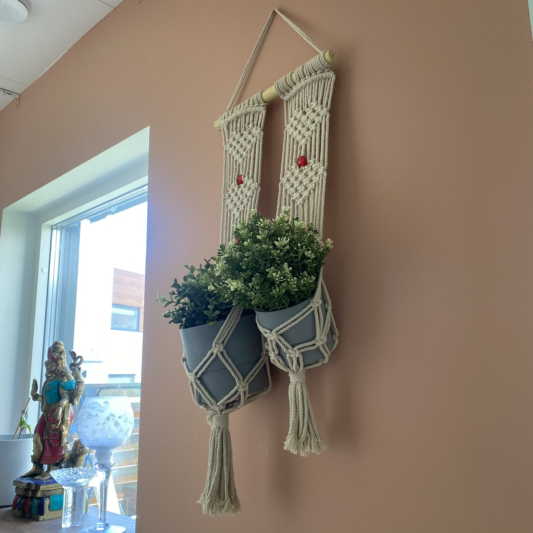 Design: Handwoven macramé double plant hanger (holds 2 pots)