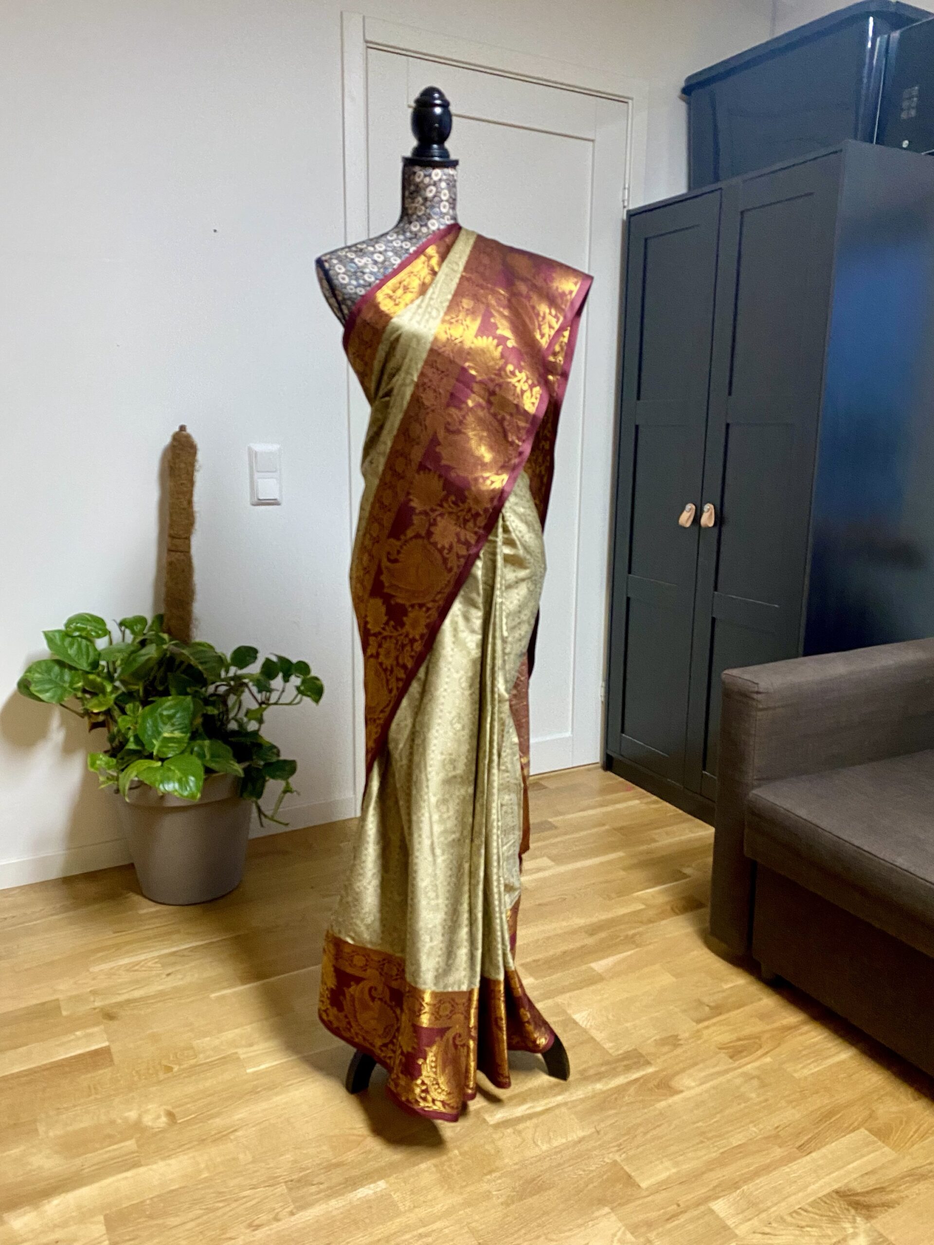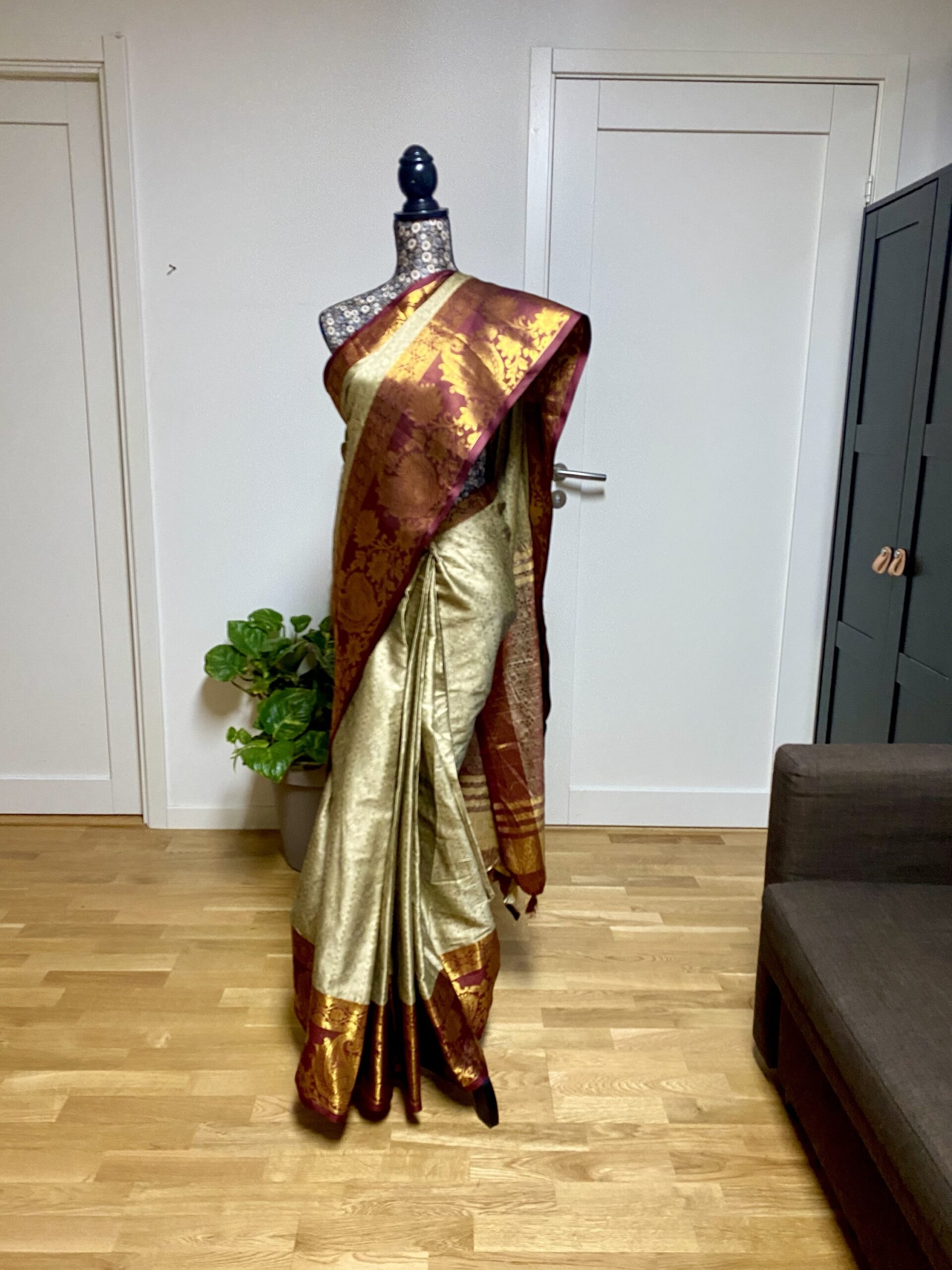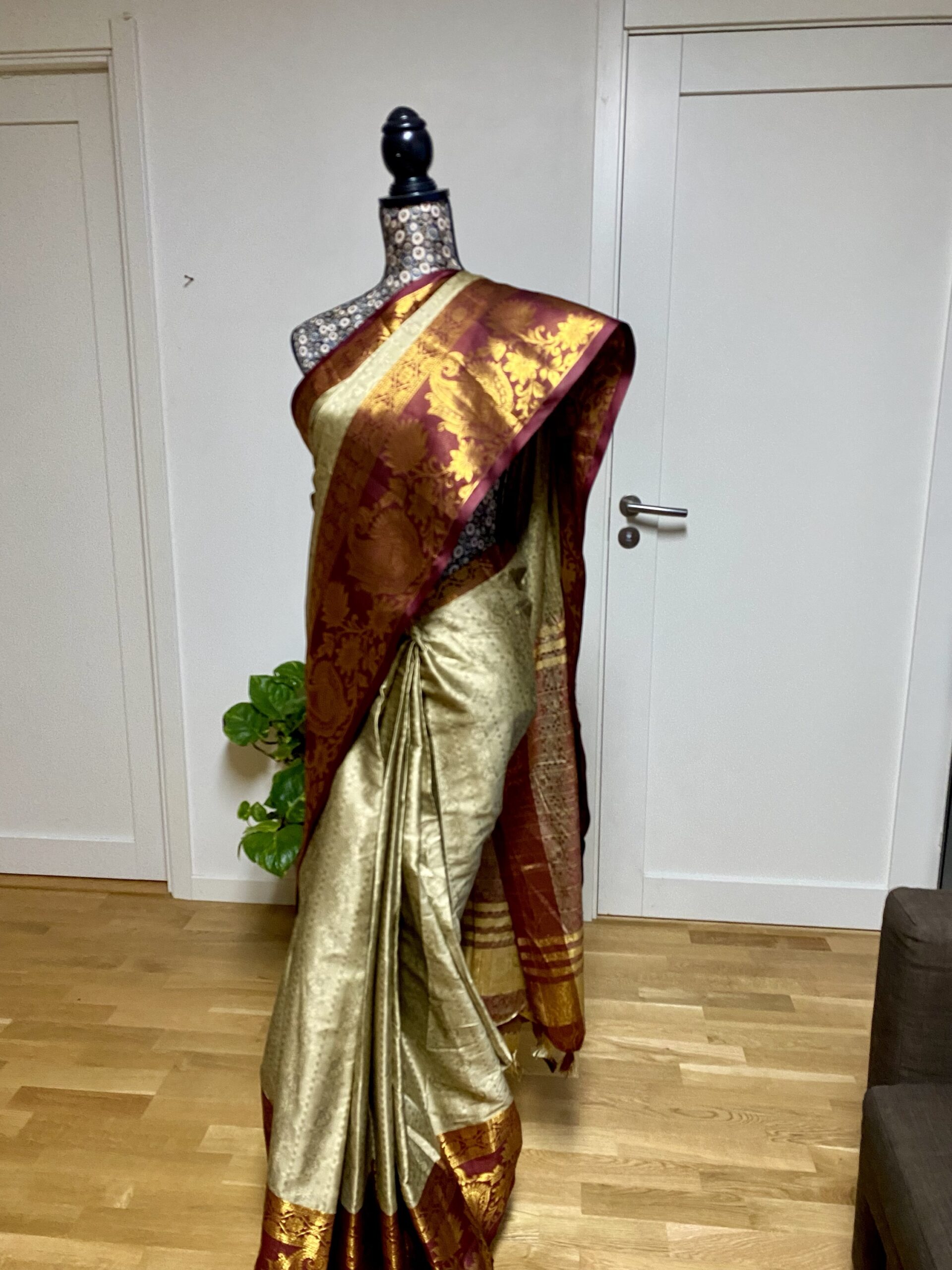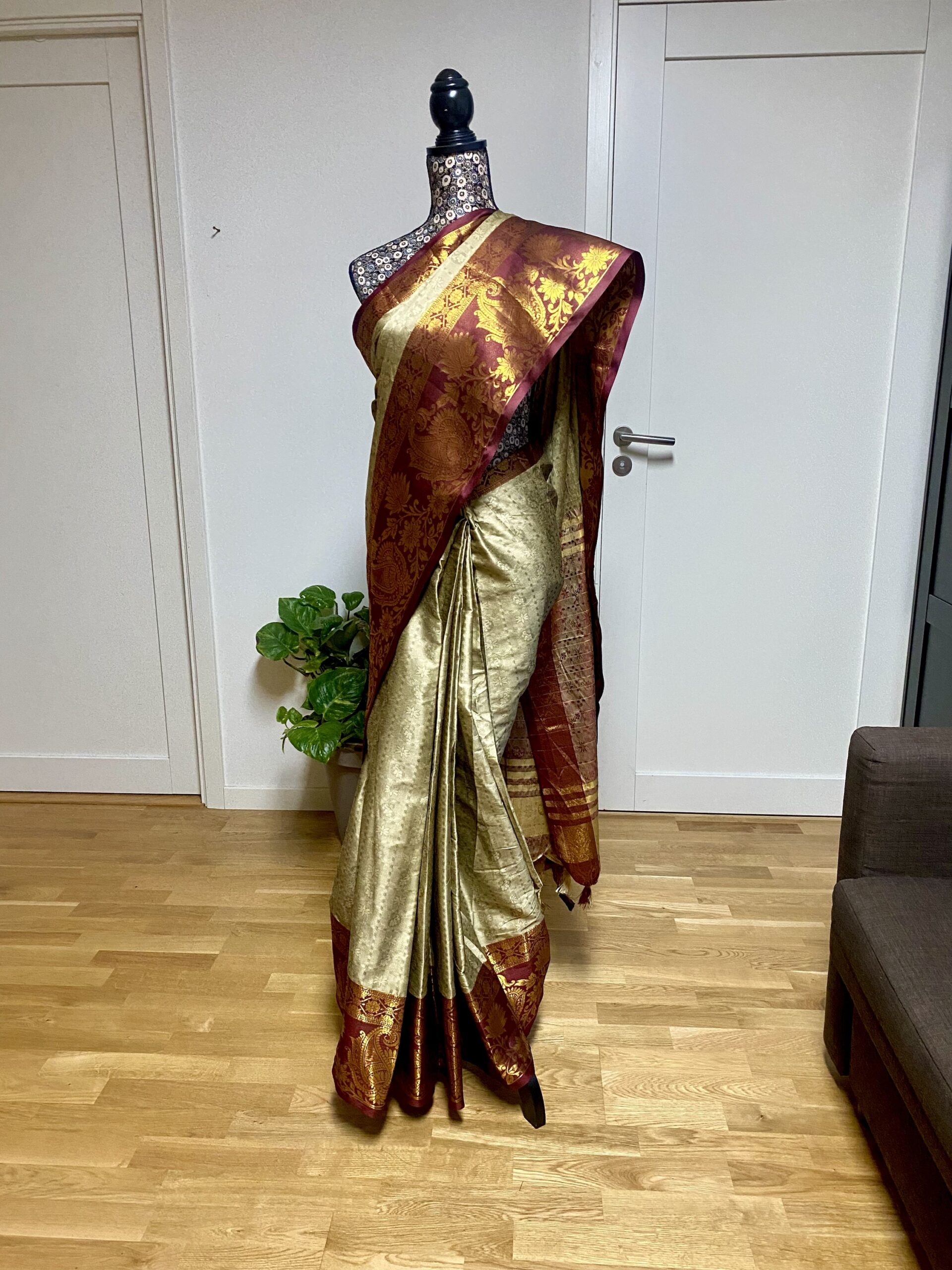 A ready-to-wear one minute saree in rich maroon and antique gold, designed with pre-stitched pleats for quick and effortless draping. The gold tone carries a subtle olive undertone, giving it a classic yet slightly earthy festive appeal.