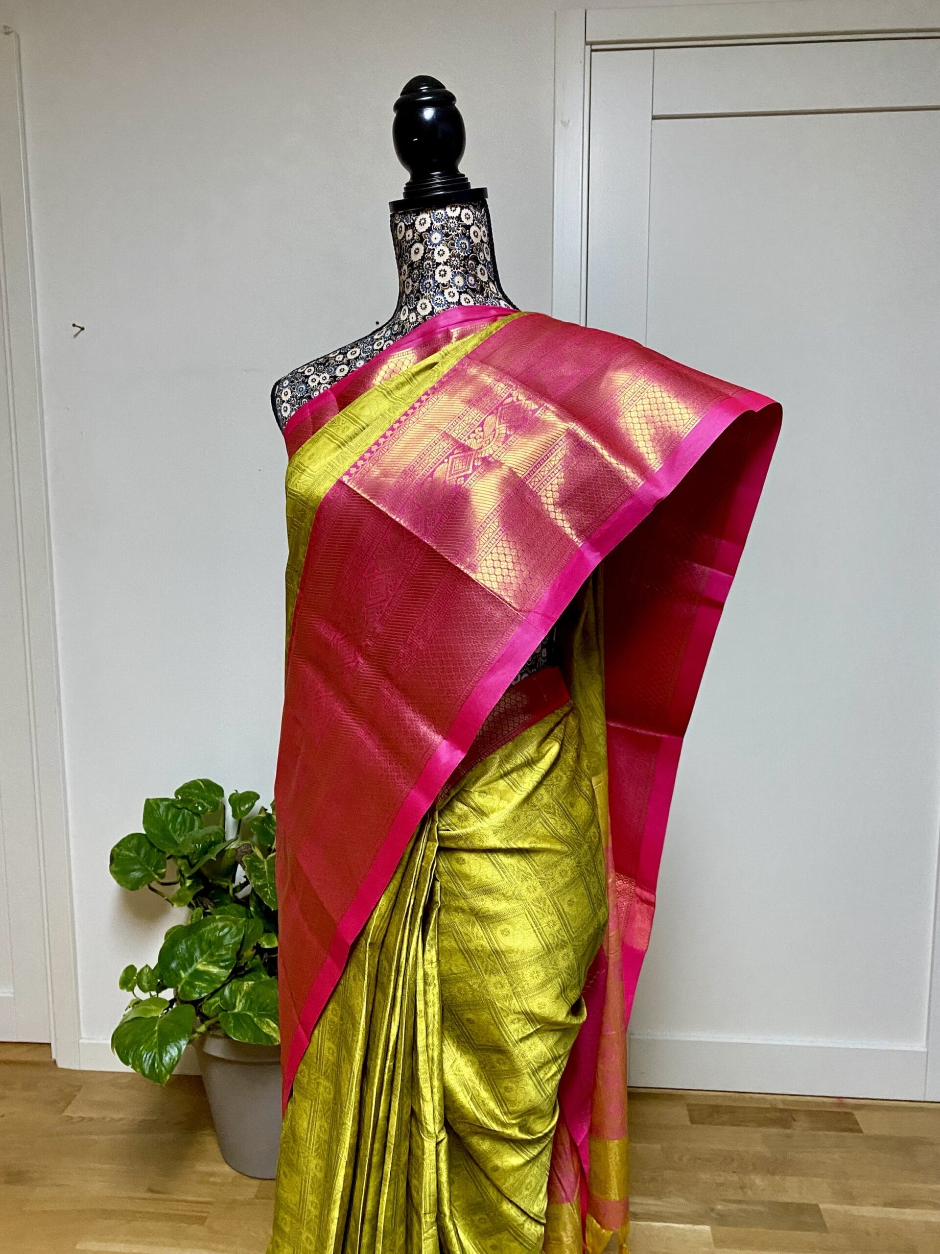 A ready-to-wear one minute saree in rani pink and mustard yellow, designed with pre-stitched pleats for quick and effortless draping. The mustard base carries a subtle greenish undertone, giving it a fresh and vibrant festive look.